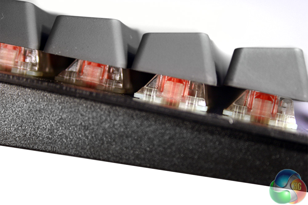 The keys themselves are quite curious looking from the side, since each one features a clear switch housing. This is again, to let the backlighting really shine through, but it makes them look quite distinct even without power.