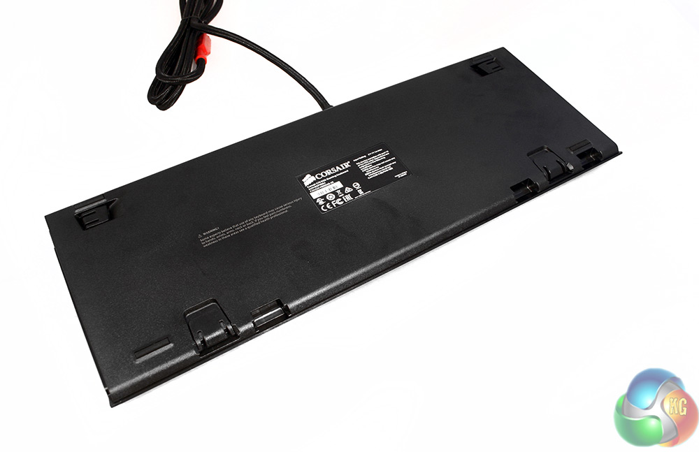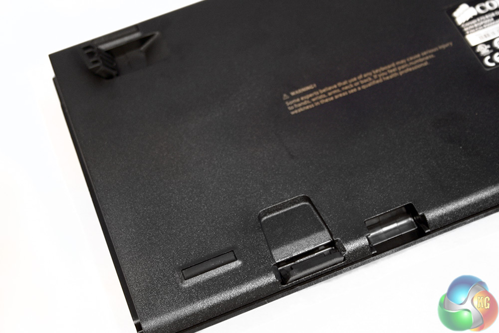 The underside of the Vengeance K70 RGB is your standard black plastic (the brushed aluminium is only a thin top later) with some tilt supports to let you raise the height of the whole keyboard, or just the front or back if you prefer. There are also rubber rests to stop it sliding around when in use, as well as a disclaimer suggesting that experts claim using any keyboard is bad for you, so take a break now and again.