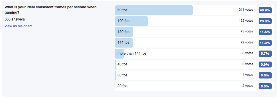 As you can see, out of those we managed to poll, 48.9 percent are content with remaining at 60 frames per second, meanwhile 20.8 percent of you really prefer gaming at at least 100Hz. Once we add up the results though, things start to look a bit divisive, with 49.3 percent of those polled preferring to game at various refresh rates from 100 frames per second and up.