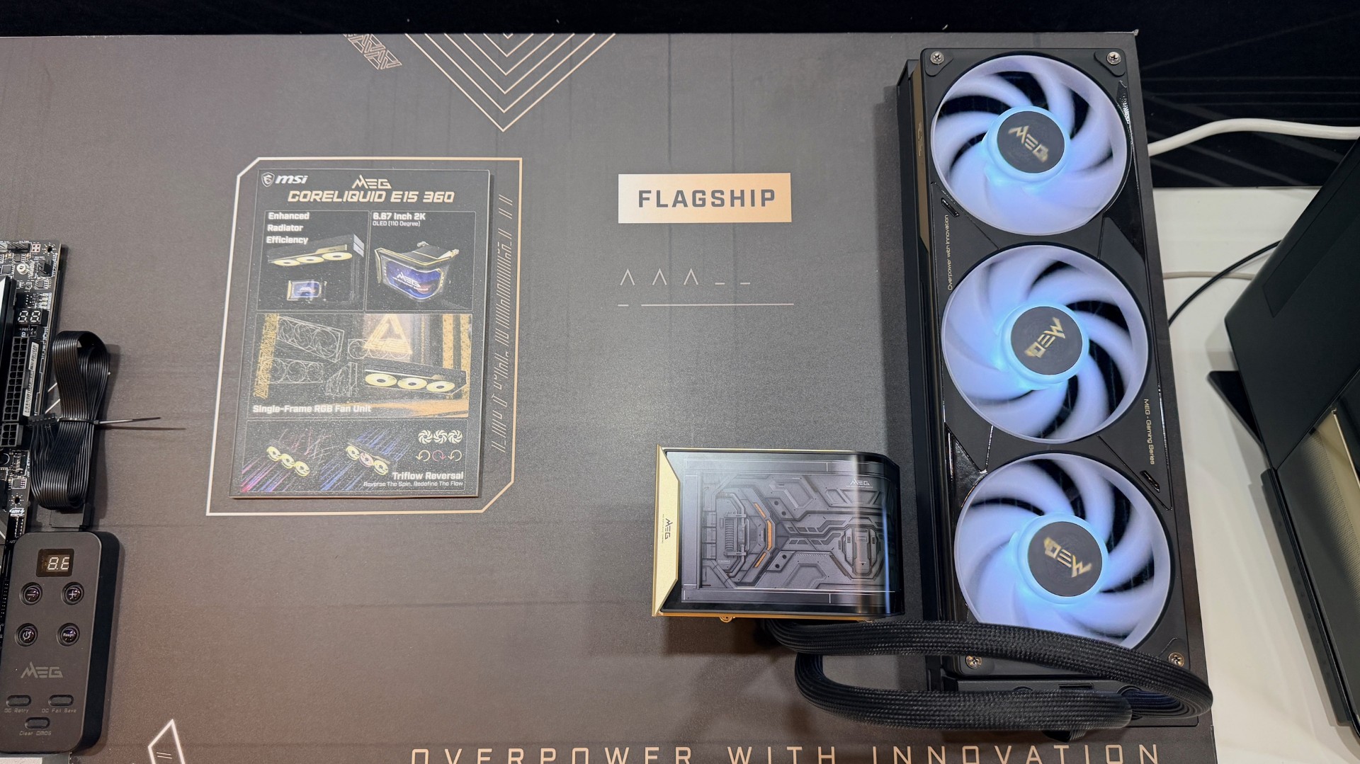 Cooling is handled at the top end by the MEG CoreLiquid E15 360. Beyond the obvious headline feature (which is a curved 6.67-inch OLED display with 2K resolution), the more interesting detail is the fan and cabling architecture.