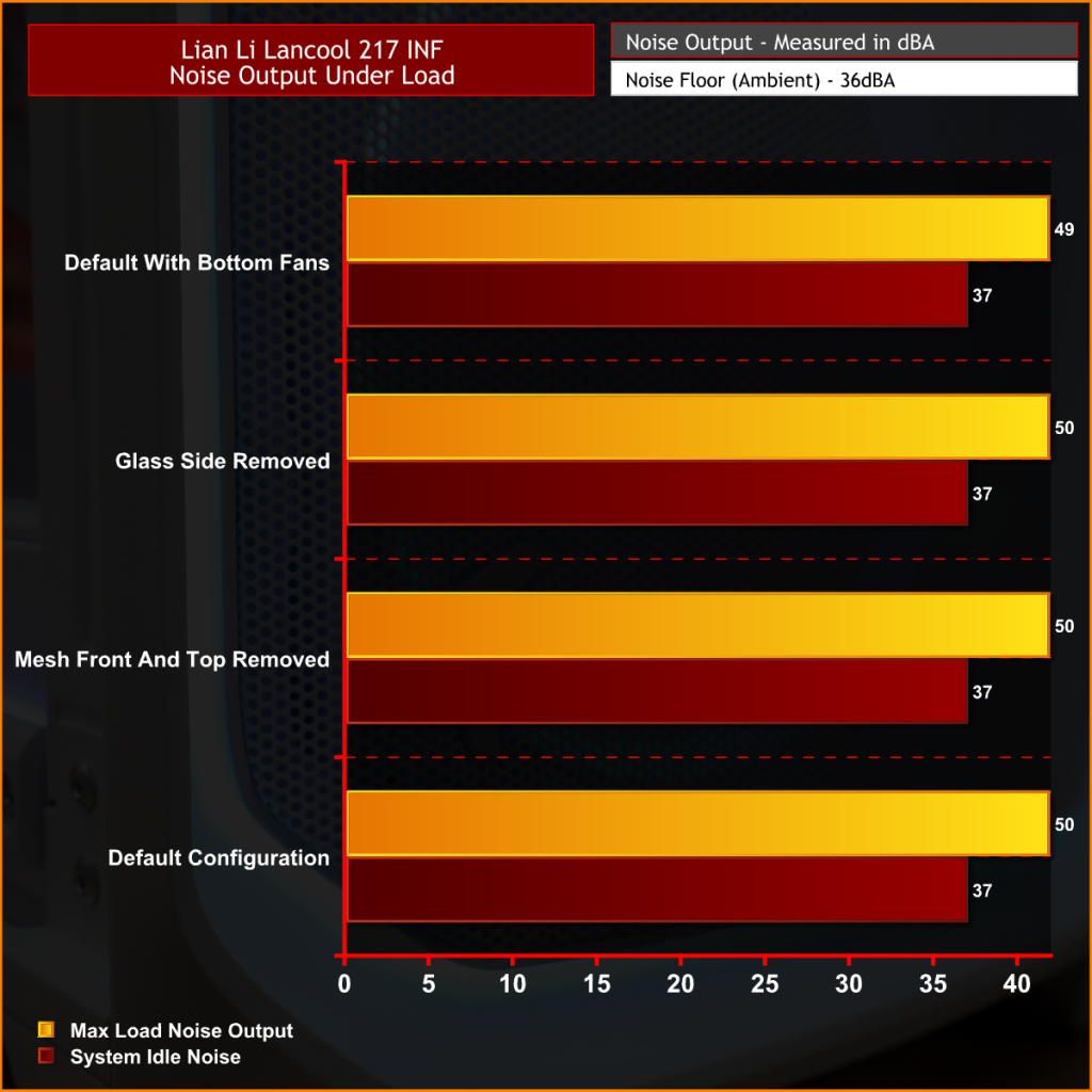 Noise performance from the Lancool 217 INF stayed very consistent across all configurations, with system idle noise sitting at around 37 dBA regardless of setup. Under load, most configurations peaked at 50 dBA, showing that removing panels or swapping materials didn’t noticeably alter the acoustic profile.