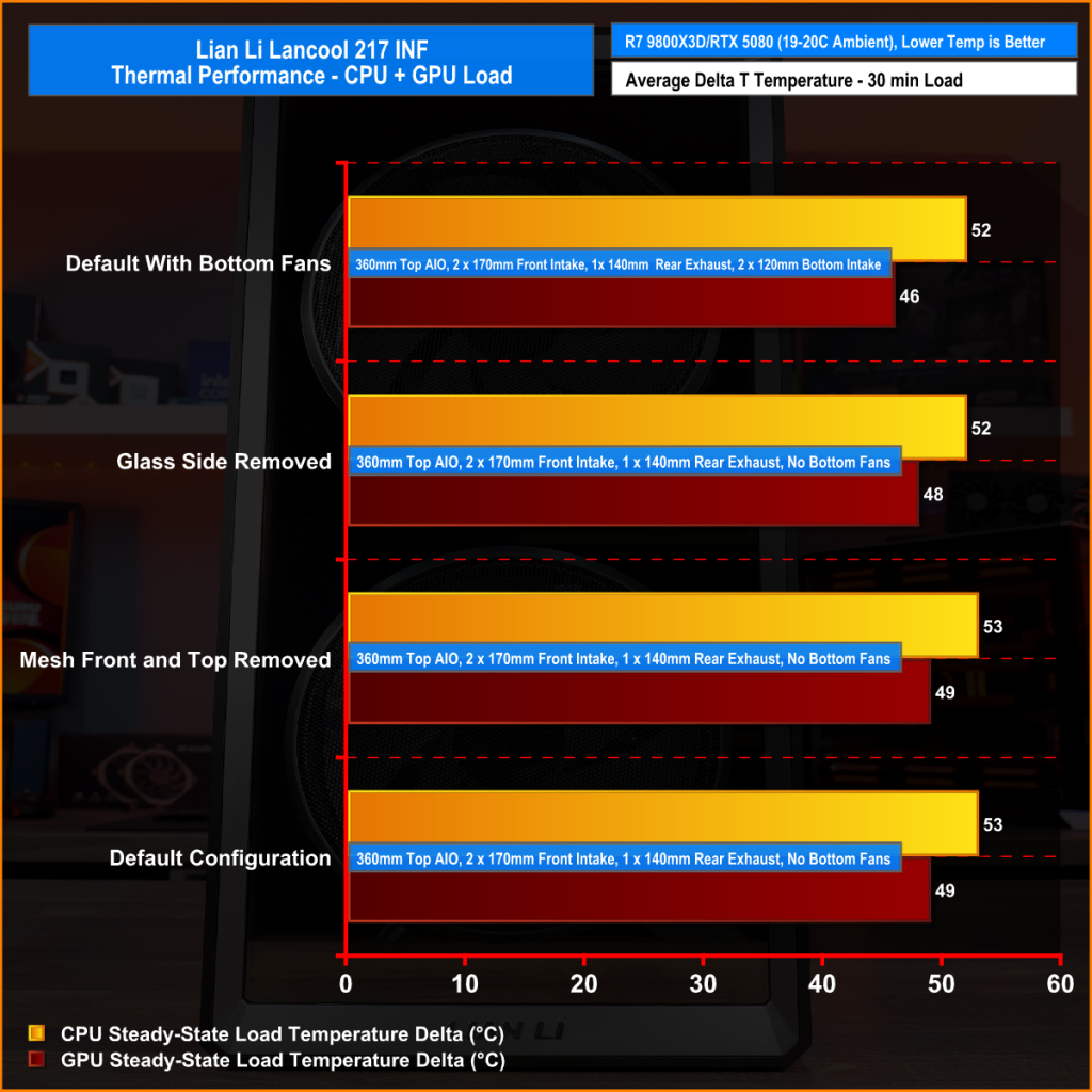 In terms of thermals, the Lancool 217 INF delivers solid results straight out of the box. In the default configuration, the CPU recorded a steady-state temperature of 53°C over ambient, while the GPU sat at 49°C over ambient under load. Removing the glass side panel or swapping the front and top mesh out didn’t significantly alter these results, showing that the case’s airflow design is already very efficient as standard.