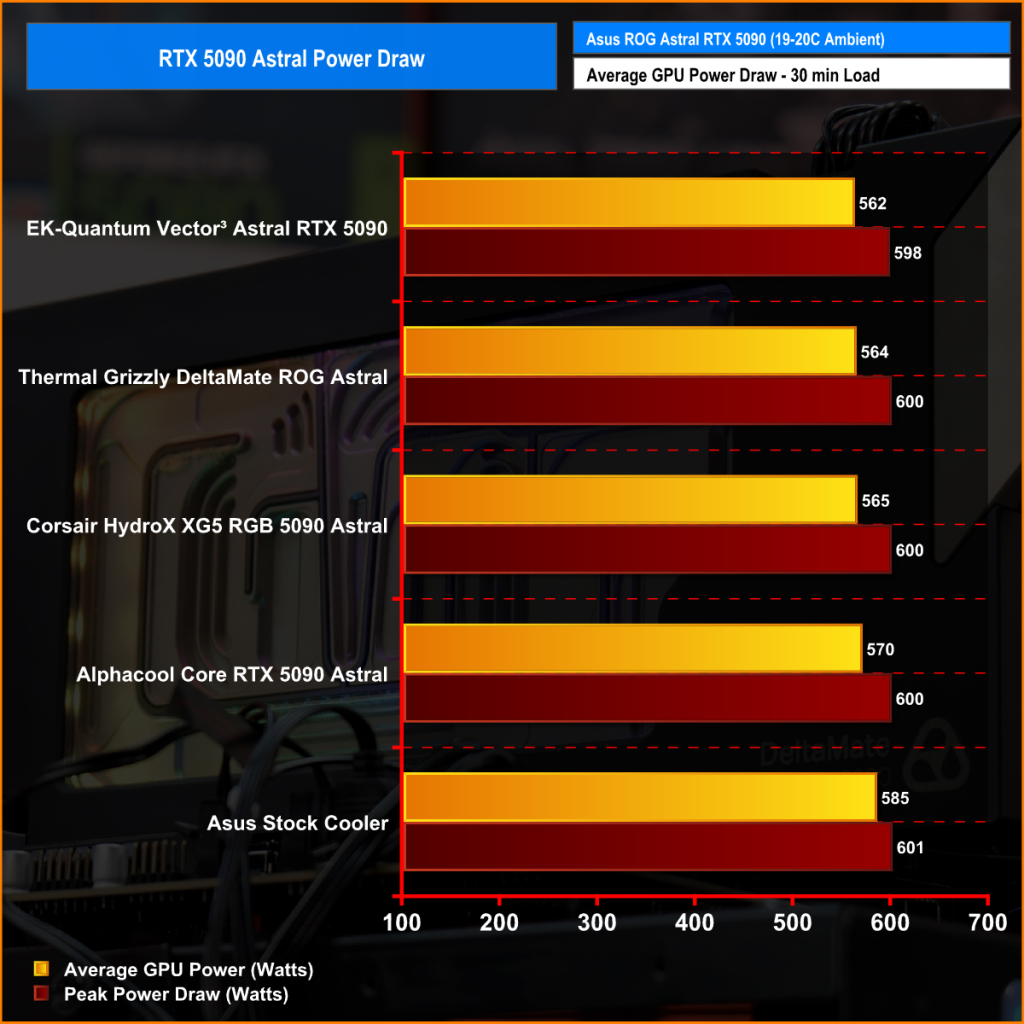 Average power draw follows a similar pattern, but in all scenarios, the peak power draw is 600 watts, even with the stock cooler. There is some slight variation between the custom water blocks, with the EK block achieving the lowest average power draw and the Alphacool block the highest, but only 8 watts separate them.