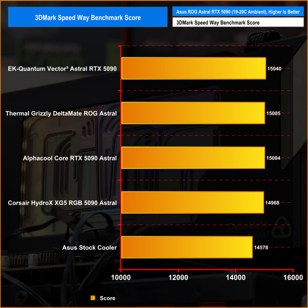 Then finally benchmark performance. As we have seen with the other tests, there is a noticeable improvement in 3DMARK Speed Way benchmark performance with the custom blocks installed. Speed Way performance increases by 400 plus points using the custom water blocks with Thermal Grizzly DeltaMate, EK and Alphacool blocks, all very close at around 15000 points.