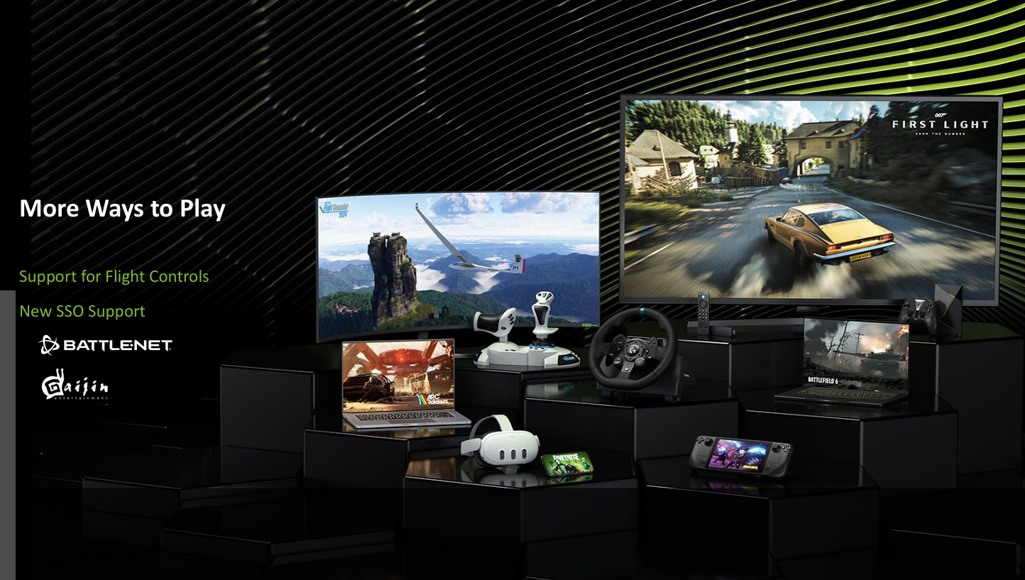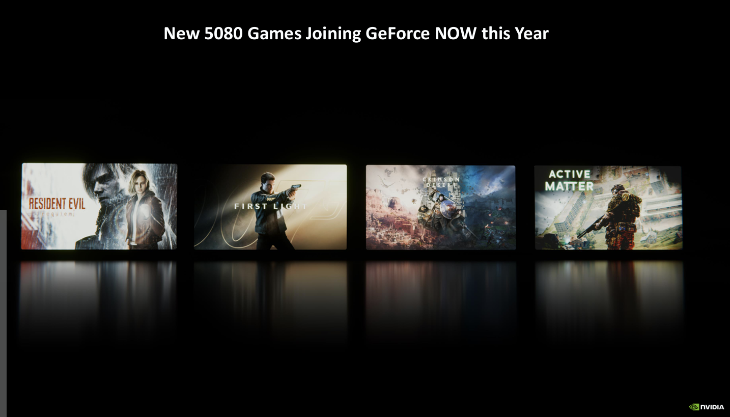 The final few announcements pertain to GeForce Now, Nvidia's cloud gaming service. Last year, the GeForce Now Ultimate servers were upgraded around the world to house RTX 5080 graphics cards. Now, Nvidia is rolling out native GeForce Now clients for more devices, including Linux-based PCs and Amazon Fire TV devices. Peripheral support is also expanding, so you can now move beyond a simple game controller to racing wheels and flight sticks for supported racing and flight sims. In the coming months, major titles like Resident Evil Requiem, 007 First Light and Active Matter will be available to stream day-one through GeForce Now.