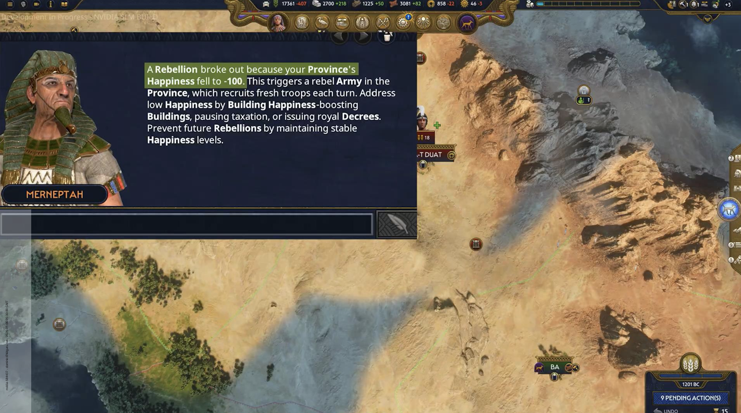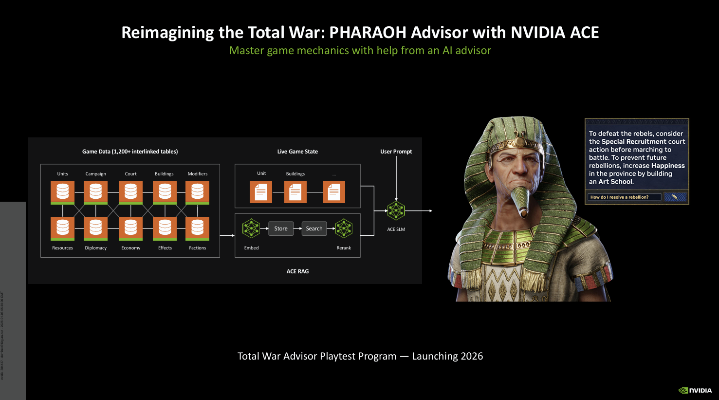 The Nvidia ACE AI suite is also being showcased with new potential use-cases. For instance, the ACE Small Language Model could be used to greatly enhance the Advisor in Total War: Pharoah, giving the player more relevant tips while building up a prospering civilisation and army.