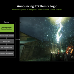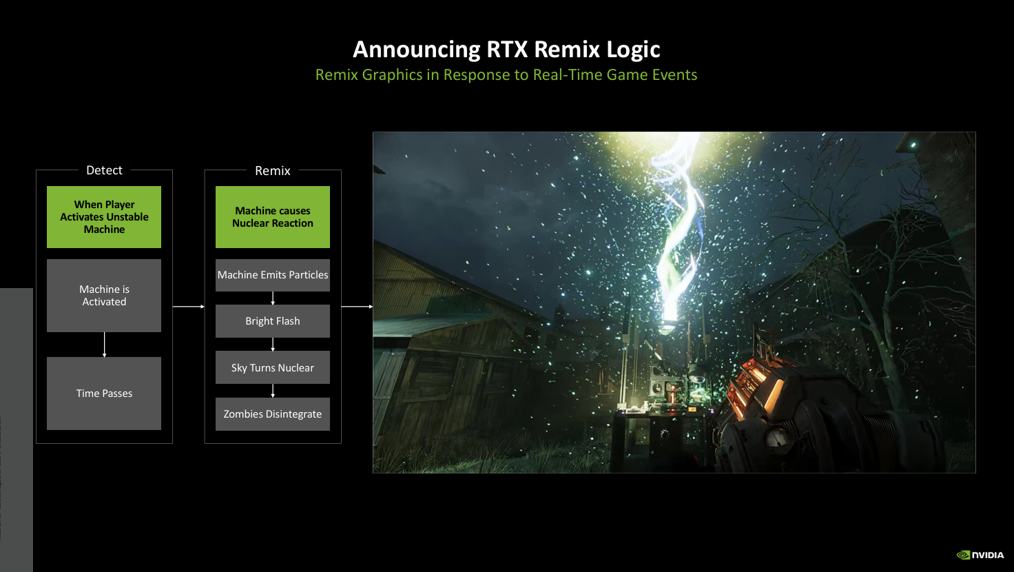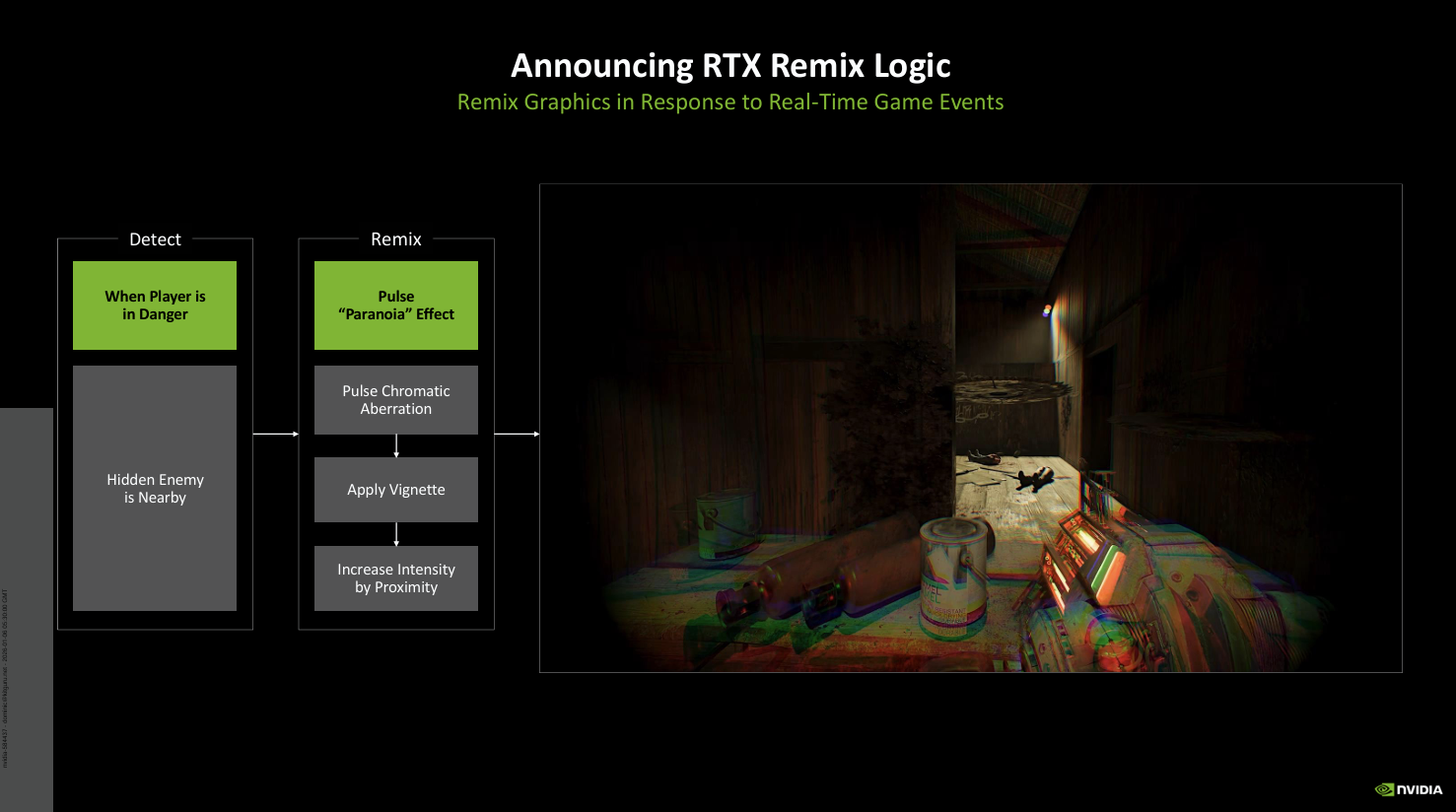 The RTX Remix modding project is also seeing some love at CES this week. RTX Remix Logic will allow modders to inject newly remixed graphical effects like particles in response to real-time game events, such as activating a machine in Half-Life 2, or adding in chromatic aberration in response to the player being in danger from a hidden enemy, creating a visual sense of paranoia.