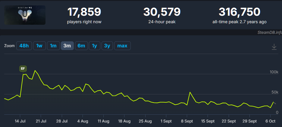 This week, Destiny 2 hit its lowest daily concurrent player count since the game first released on Steam, with just over 16,000 players logging in worldwide. This is a rather large drop-off from the peak concurrent player count of over 108,000 players when the latest expansion, The Edge of Fate, launched in June.