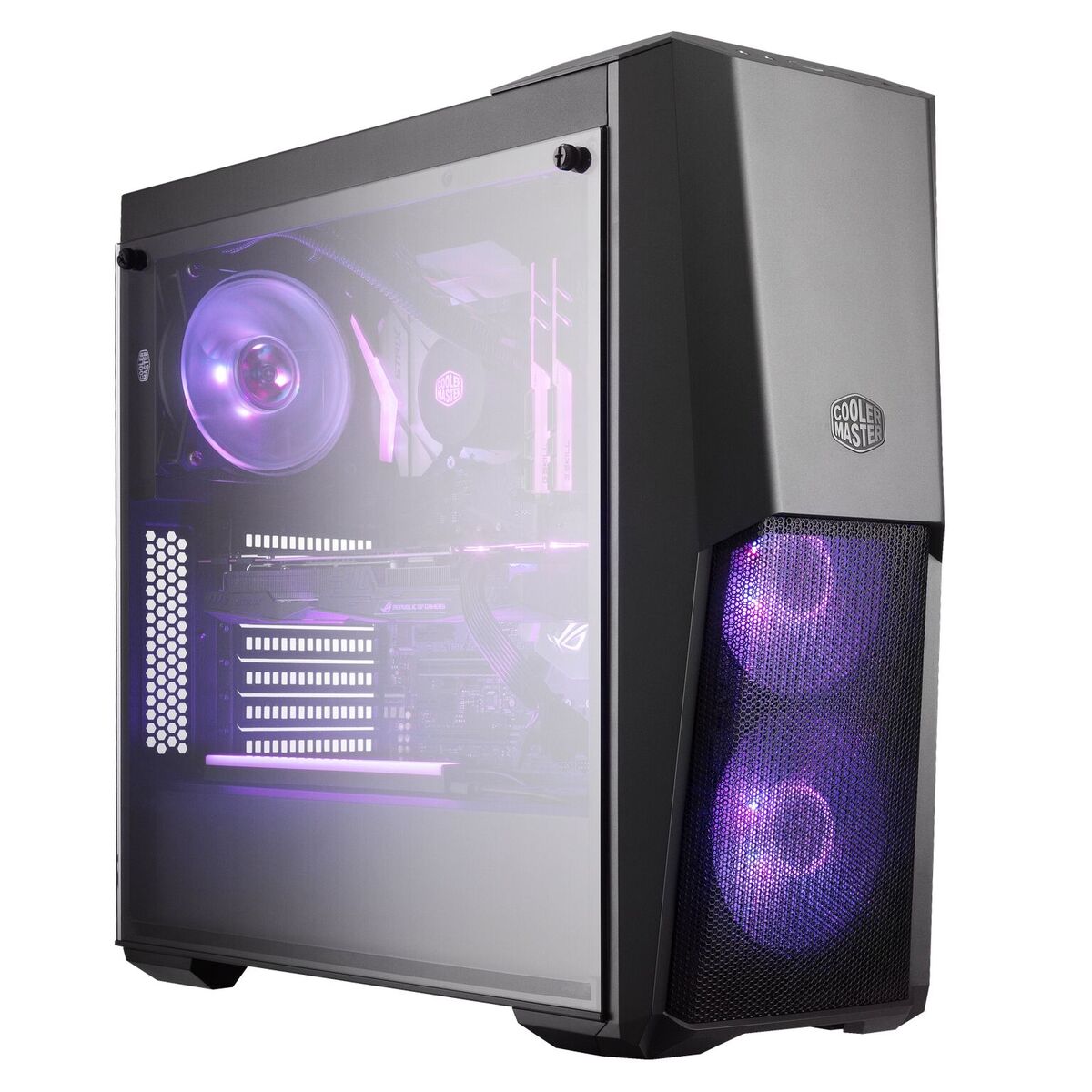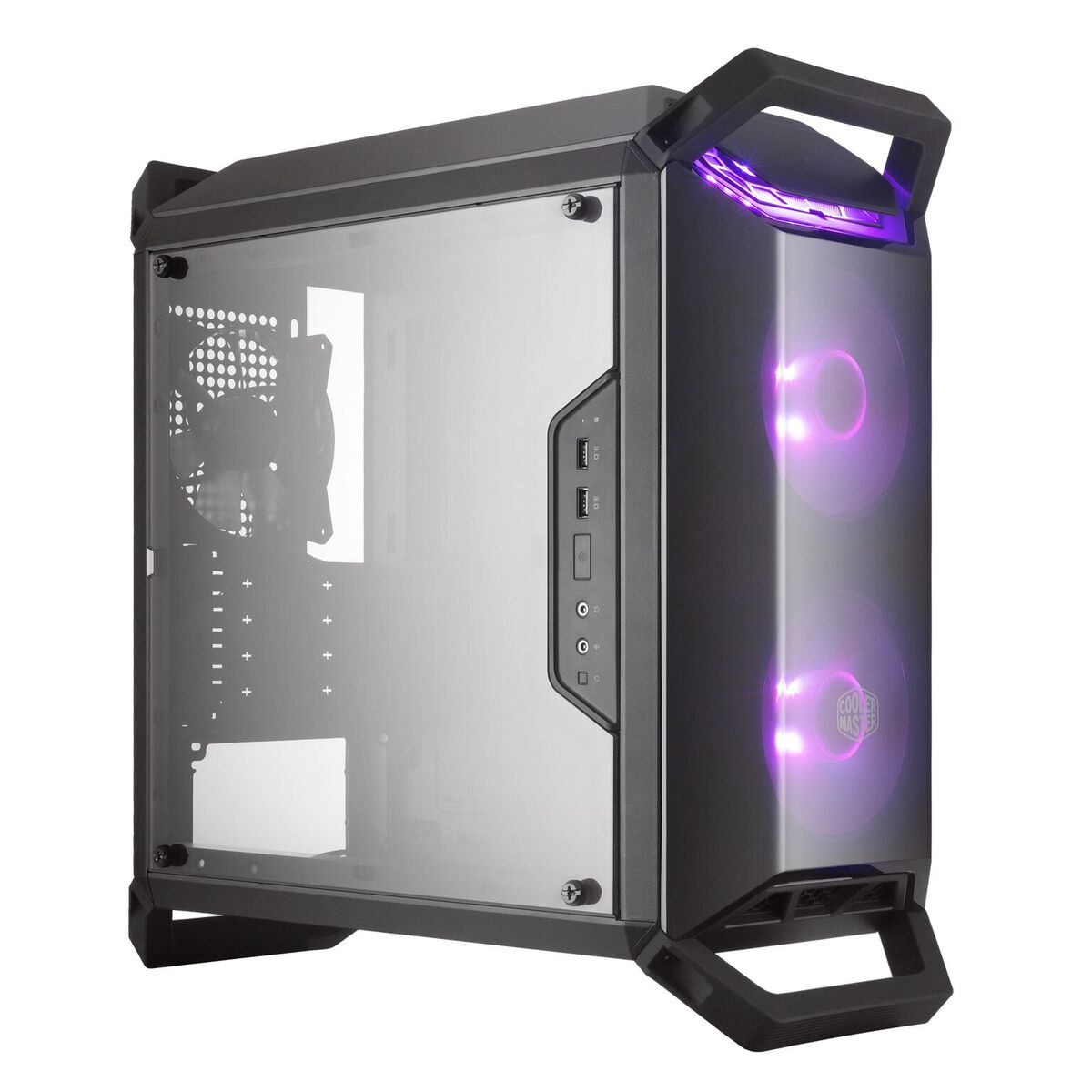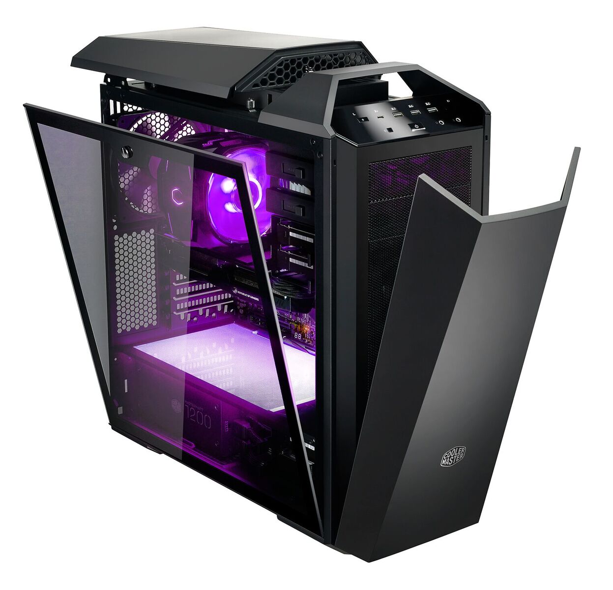 First up is the MasterCase H500M, a mid-tower chassis that affords its user the ability to choose between form or function by offering an interchangeable tempered glass or mesh styled front panel. The case ships with two sizeable 200mm addressable RGB fans at the front of the case for maximum airflow. The MasterCase H500M houses a Type-C USB port, four USB 3.0 ports and two 3.5mm jacks on the front panel, keeping it up to date. Complete with a windowed power supply shroud, cable covers and support for 360mm radiators, this is a chassis built for versatility as well as aesthetics.