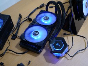 After that, we turn to cooling. First of all, the P7-F12 Pro RGB fans are definitely worth mentioning as they look to offer very good value – consumers will receive 3x 120mm RGB fans, plus the controller, for $49.99. Next, Aerocool was also keen to show off its new RGB liquid cooler. A key feature here is the rotatable Aerocool logo – so whichever way you mount it, you can flip the logo round to make sure it is the right way up.
