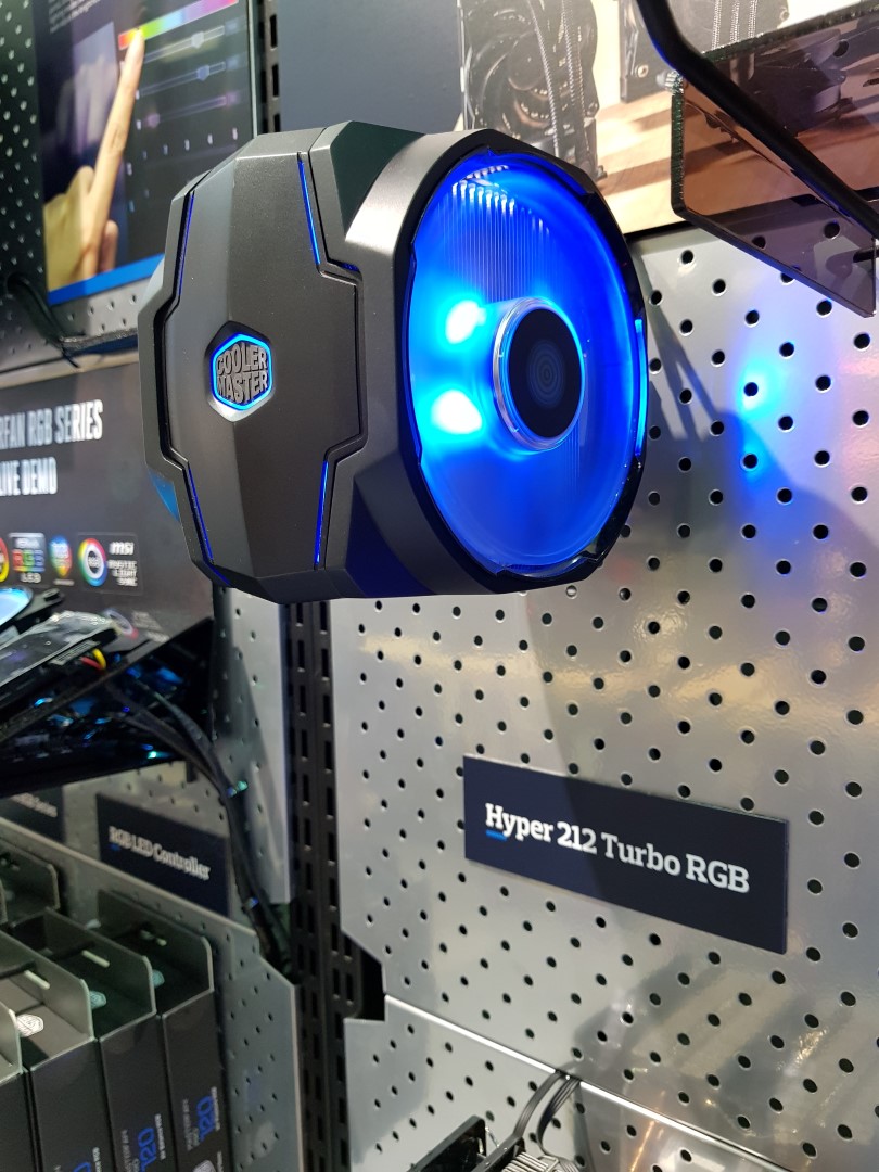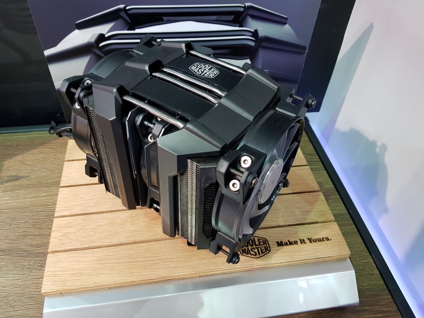 Moving on to the new coolers, there is a lot to talk about here. First of all, RGB lighting has come to Cooler Master's coolers, including RGB versions of the MasterLiquid and Hyper 212 Turbo coolers. Following on from that, Cooler Master announced the MasterLiquid Maker 240 – a custom loop kit for beginners. Coming as one big package, consumers will receive soft tubing, magenta red stock coolant, copper fittings and a good-looking water block as part of the new kit. Lastly, Cooler Master has also tweaked its 3DVC (3D vapour chamber) technology to create a monstrous, 3-fan air cooler that also features extended 3DVC piping.