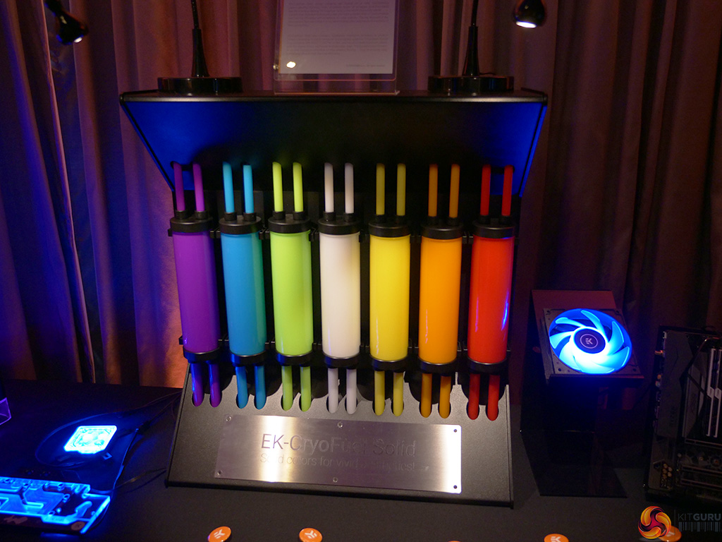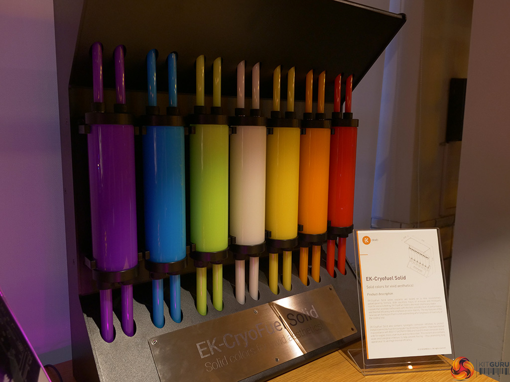 Finally, we get to all new coolant. EK-Cyrofuel is a solid pastel coolant and extensive testing has taken place to ensure it is not abrasive. It's a big claim, and the coolant looks very impressive. You'll be able to get Cyrofuel later this year in purple, green, blue, white, yellow, orange or red.
