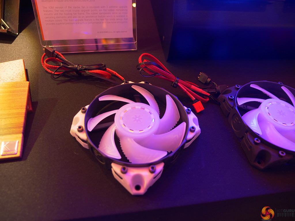Starting off with new fans. EKWB has two new fans coming up, the Vardar X3M and the Vardar RGB. The X3M features ‘addressable RGB', which we spoke about quite a bit during our Lian-Li coverage. ARGB is essentially digital, allowing fans to be connected to RGB headers on the motherboard, paving the way for better synchronization and more options. The X3M fans also come with chunky silicon corners that will come in different colours, similar to Noctua's ‘Chromax' fans.