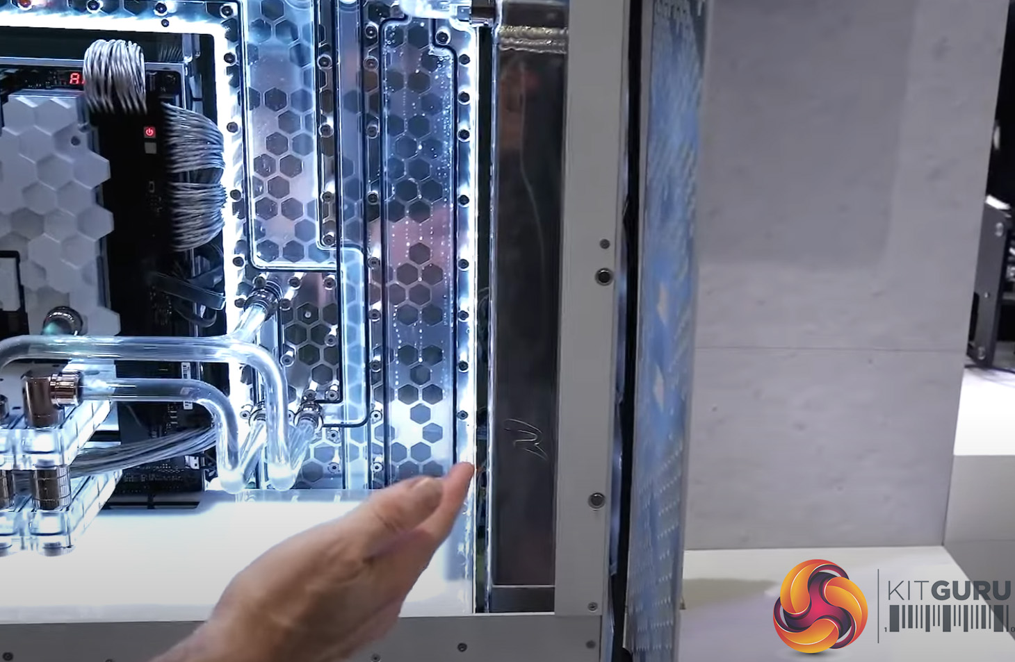 Each loop has a dedicated Nexalus 8Pack Pump which has been optimised to provide 25% improved flow while only taking up two-thirds of the space. A custom-built mono-block has been installed to cool the motherboard's VRMs and CPU, while a bespoke distro-plate encompasses the hexagonal design of the outer chassis.