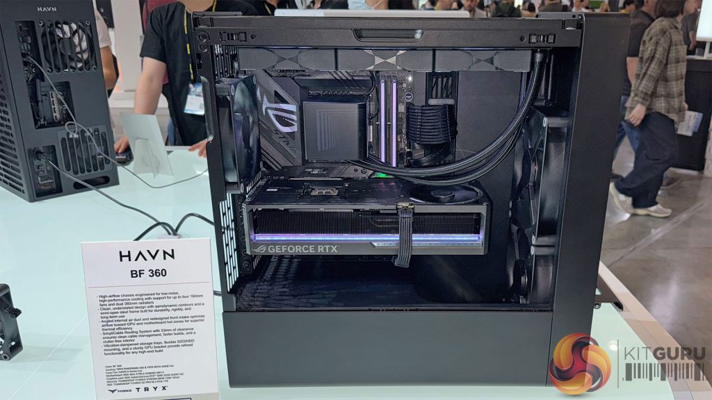 HAVN, the chassis and cooling specialist introduced as a sub-brand of Pro Gamersware in recent years, extended its product offering with the BF 360 case. Designed to build on the popularity of the HS 420, the BF 360 focused on high airflow and improved thermal performance while maintaining a user-friendly internal layout. It is an impressive piece of kit, that integrates easy to remove panels – with some huge fans – to make building high-end systems a breeze. It is expected to reach the market in Q4 2025. As you can see in our video, the case was being used to show what the latest H Series Performance Fan range can do. Available in multiple sizes (180×40mm, 140×30mm and 120×30mm) either in black or white – the fans have an impressive look/feel to them and spin on a new design of precision fluid dynamic bearing. Additional technical details include a specific jagged pattern on the leading edges – as well as a moulded wave pattern in the middle – that help create specific air flow patterns into the fan itself. We were told that, in tests, implementing these 2 changes improved cooling up up to 8%.