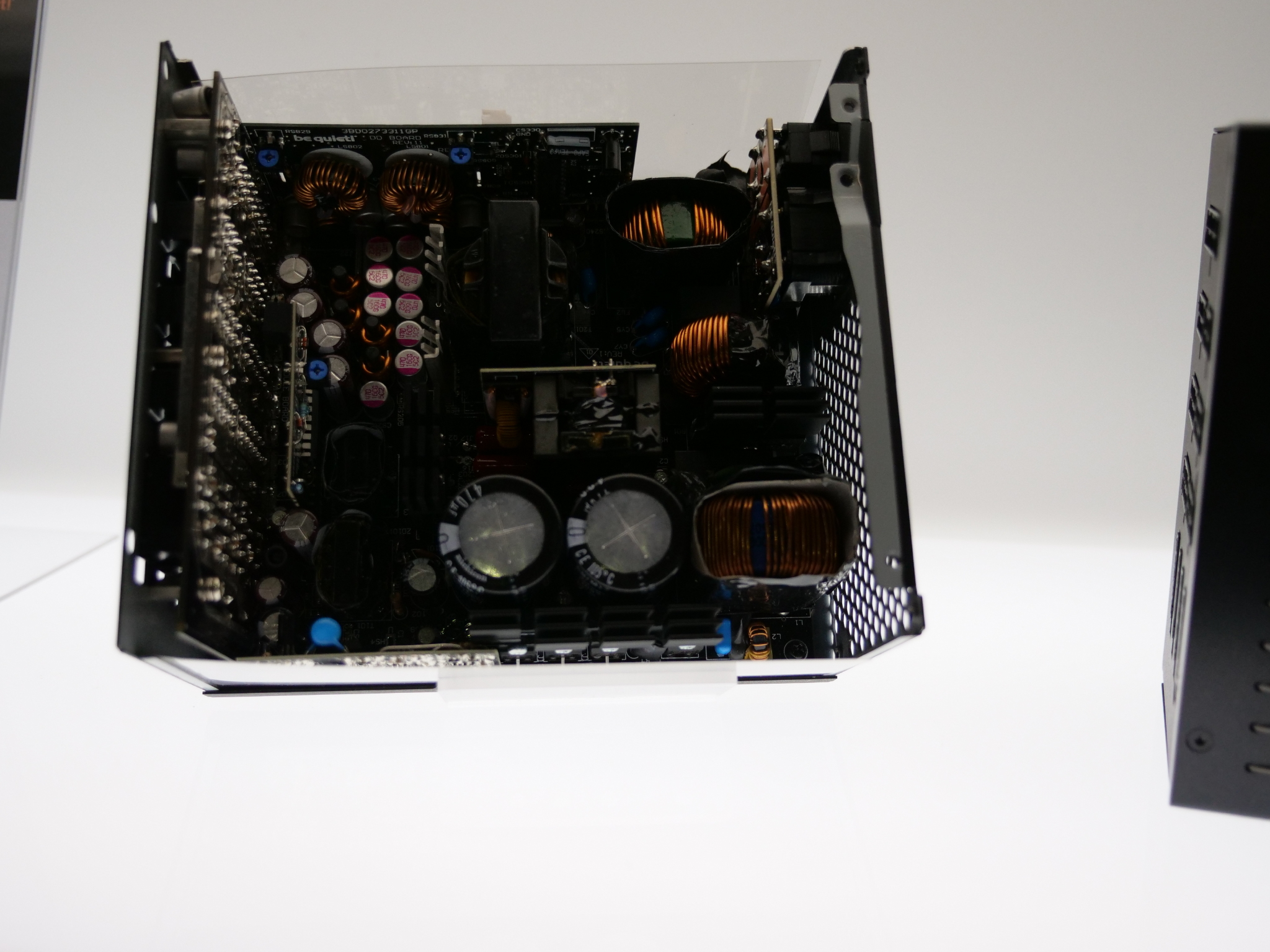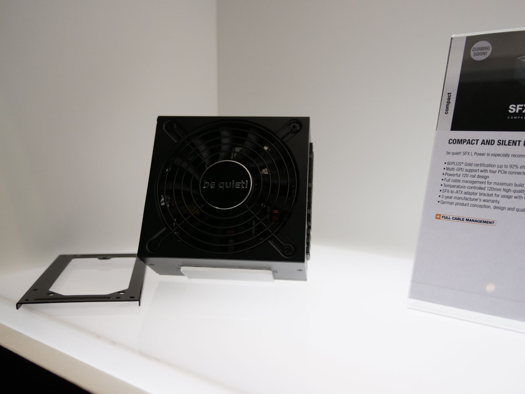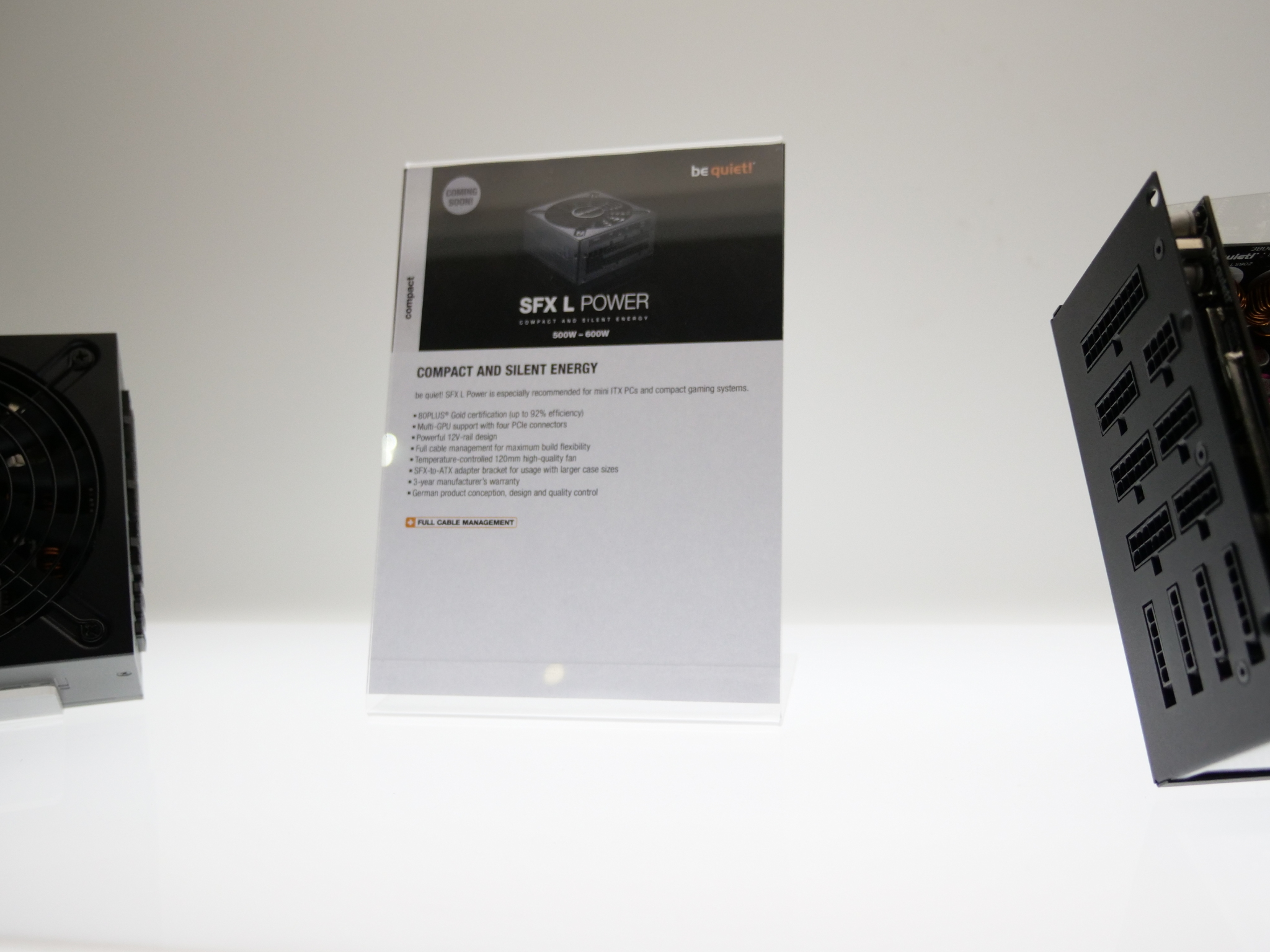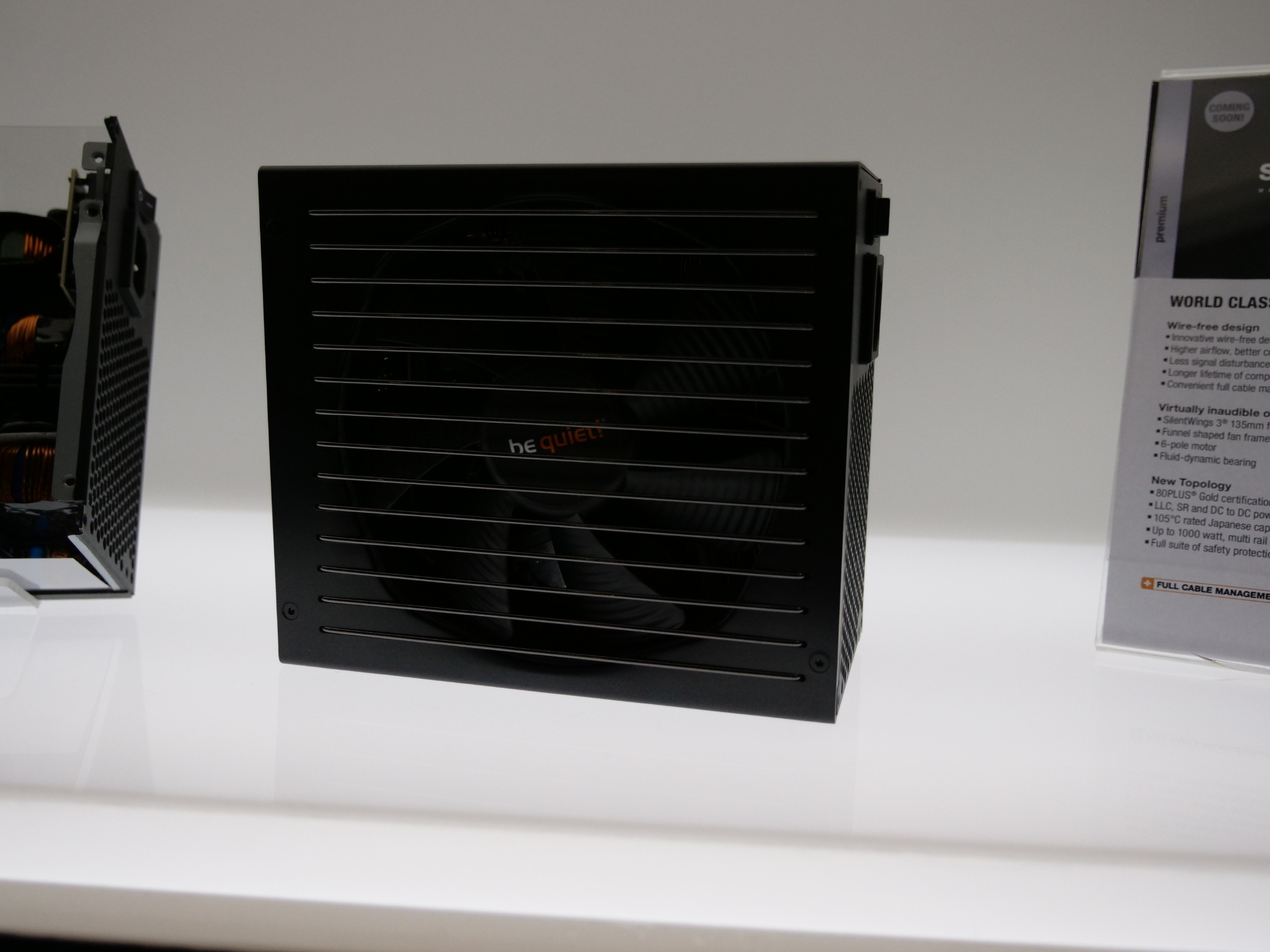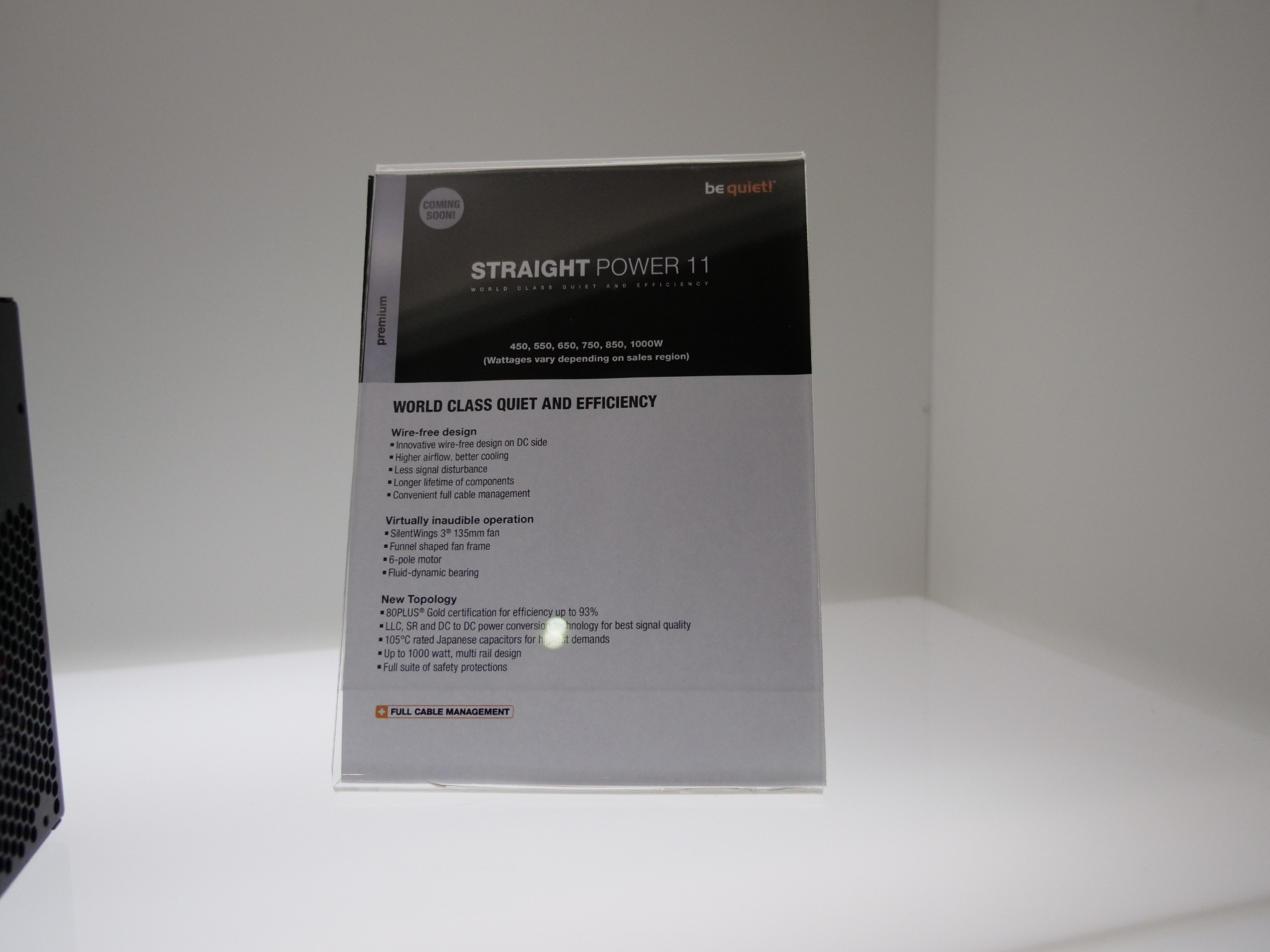 In the power supply section, bequiet! had two new models to show off, the first is the Straight Power 11 and features LLC + SR + DC/DC for improved stability. It also comes with a 135mm SilentWings 3 fan for reduced noise, Japanese capacitors, an 80Plus Gold efficiency rating and a five year warranty. Beyond that, it is designed to be wire free on the DC side, which means there is no obstruction to airflow, increases longevity and the connections between components are shorter to decrease signal disturbances.