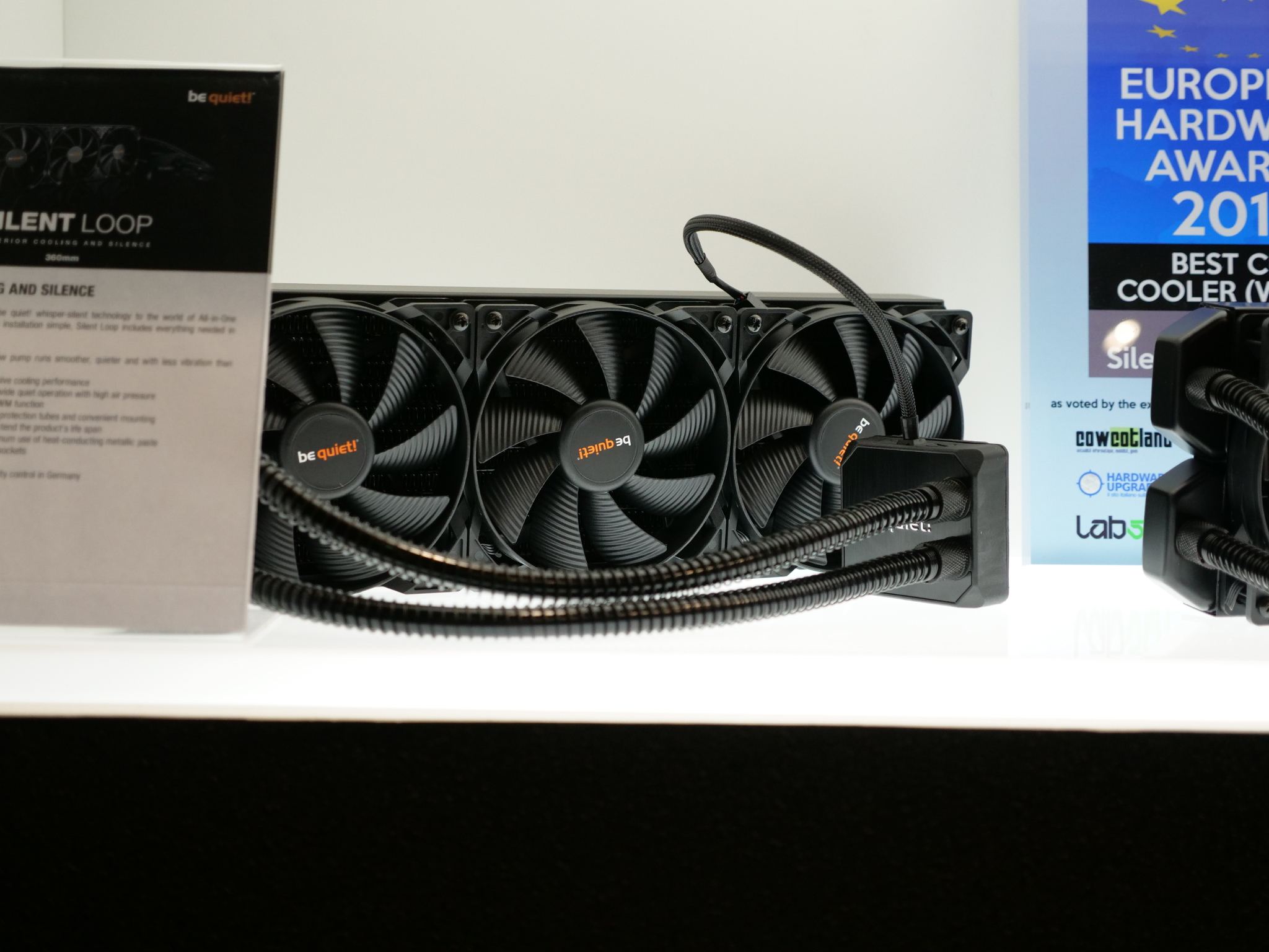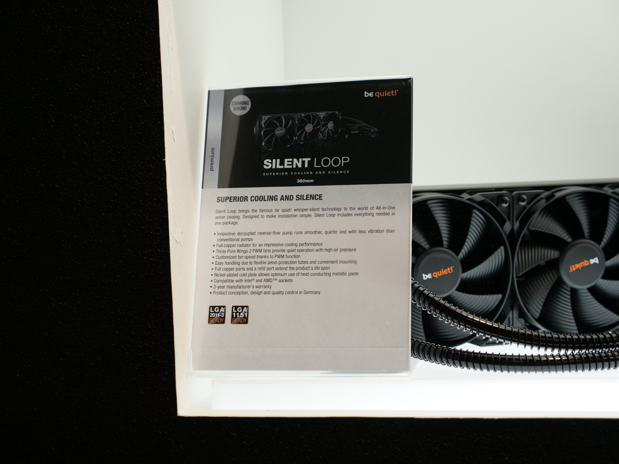 There were two CPU coolers to look at this week, the Shadow Rock TF 2 and the Silent Loop 360. The former is a top flow air cooler with 112mm of height, air guiding fins and a direct connection between the baseplate and 18 fins for quicker heat transfer. There are 6mm heat pipes, a 135mm bequiet! fan and in all, it is rated to cool up to 160W of power. It will be available within the next month for €60.