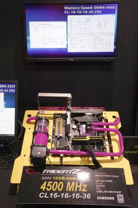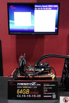 On the Z170 systems on show at Computex, the focus is placed on getting the highest frequency and tightest timings possible. Making use of an ASRock Z170M OC Formula motherboard, G.Skill has a 16GB (2x8GB) Trident Z kit running at 4500MHz CL16-16-16-36. Meanwhile on a Gigabyte GA-7170X-Ultra Gaming motherboard, there is a 64GB (4x16GB) Trident Z kit running at 3200MHz with a low timing of CL13-13-13-33 at 1.35V.