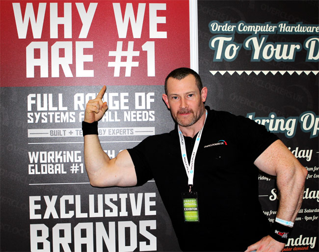 We got snap-happy around the Overclockers stand and managed to capture a rather large overclocker called 8-Pack, telling us the way it is:-