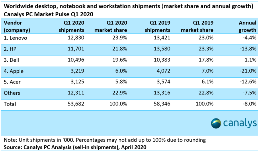 Canalys' research also investigates individual computer companies and compares their sales figures over the same period of time. Two companies that stick out from the rest are Dell and Apple, with Dell doing comparatively better than its rivals while Apple is doing worse. Dell is reported to be the only major company that managed to show a growth from Q1 2019 to Q1 2020 – albeit 1.1% growth. Apple, on the other hand, saw -21% annual growth. This is in stark contrast to how well the company usually does in sales.