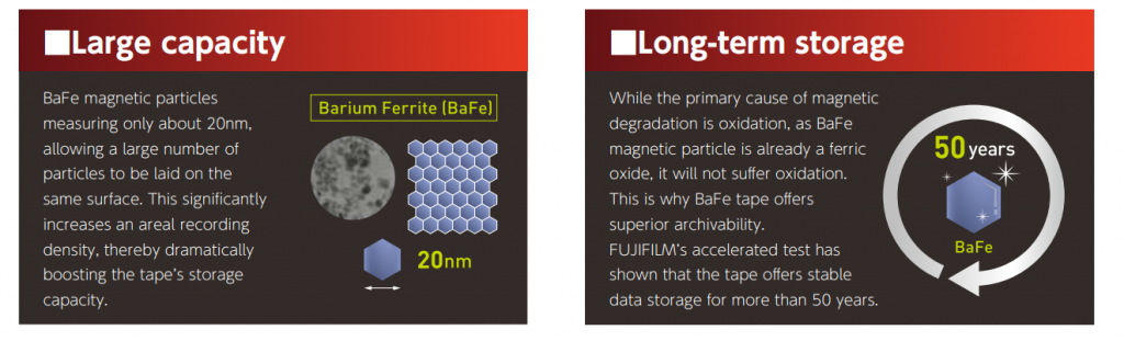 According to Fujifilm “the majority of the magnetic properties of SrFe are superior to those of BaFe, which will enable us to reach a higher level of performance whilst further reducing the size of the particles.” According to Blocks&Files, even though Fujifilm has started development of tape cartridges that will use SrFe, it is expected that the first drives using the material are still a couple of years away from hitting the market. BaFe drives with an actual capacity of 400TB are even further into the future, with availability expected around 2030.