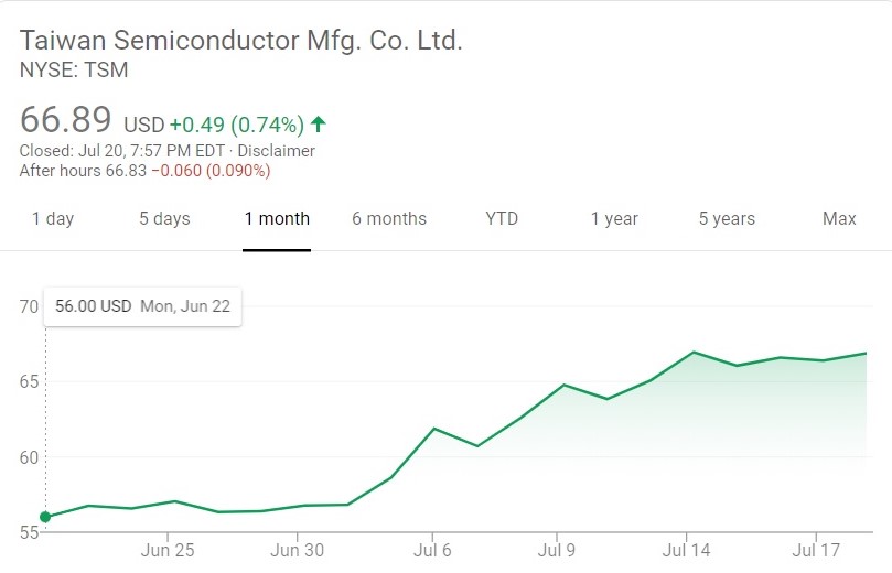 Taiwan Semiconductor Manufacturing Company, better known as TSMC, has passed its competition and grabbed the number one spot in the world as the highest valued semiconductor manufacturer. This is thanks to TSMC seeing a strong upswing in it stocks and hence, its market capitalisation, during the last month. Share prices rose by almost 20%, going up from $56 per share on June 22 to $66.89 today.