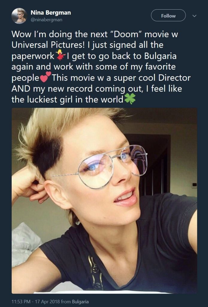 Actress and singer Nina Bergman has apparently signed up with Universal for a brand new Hollwood adaptation of Doom, according to her official Twitter account. Considering Bergman revealed that she has just signed the paperwork, if the film is in the works, it is still in the early pre-production stages.