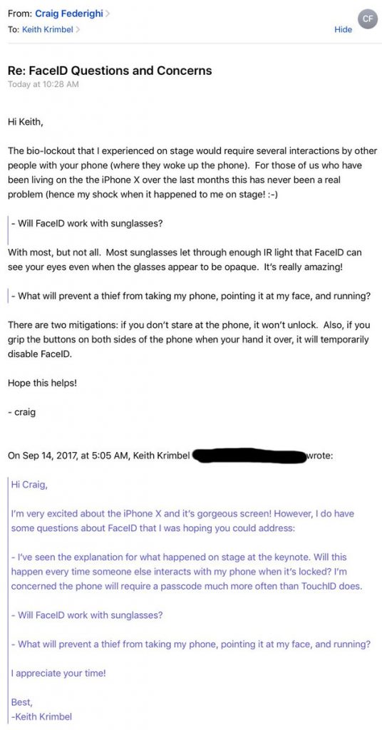 Security concerns don’t stop there, however, with freelance video editor Keith Krimbel emailing Federighi asking “What will prevent a thief from taking my phone, pointing it at my face, and running?”