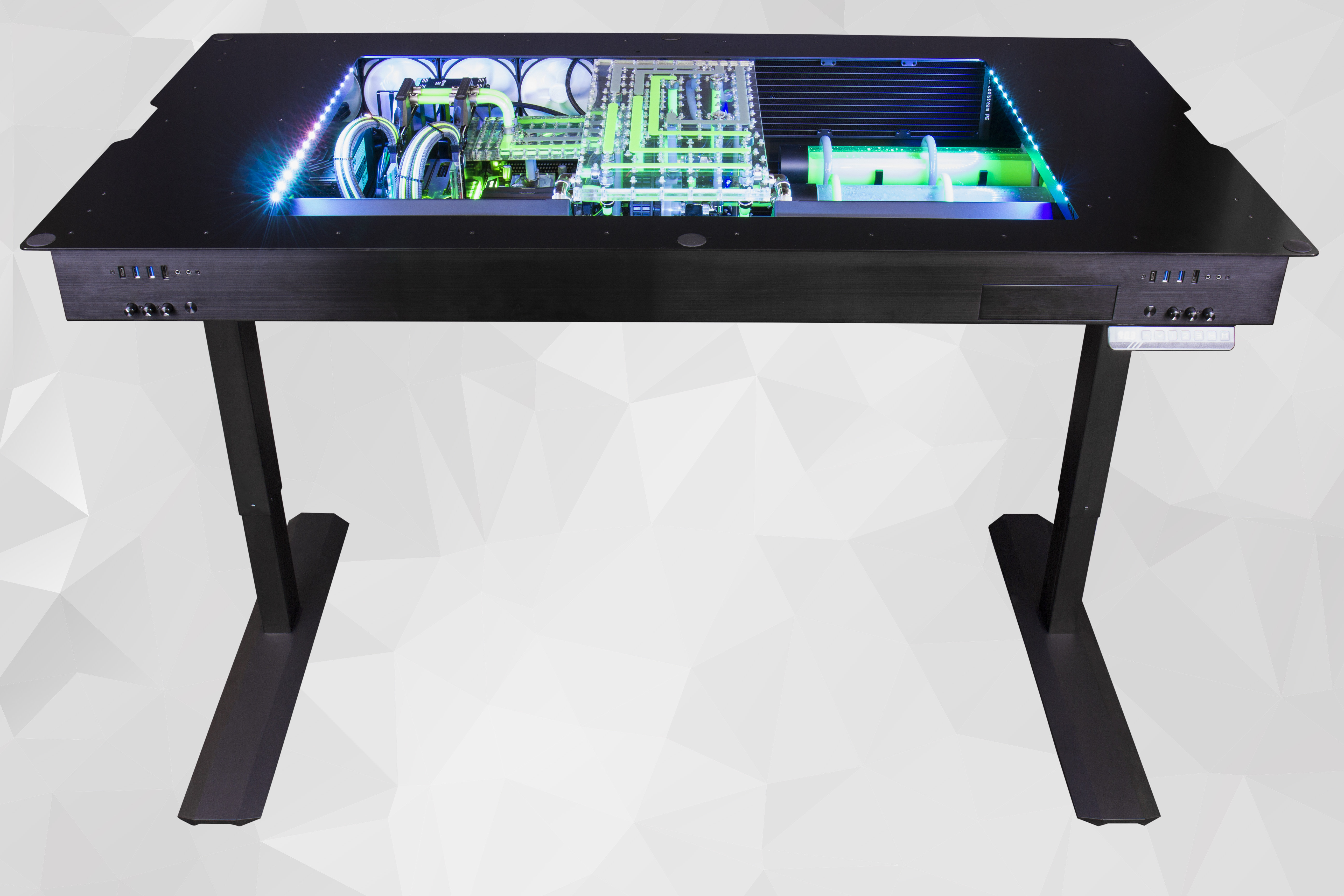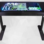 OCUK’s most expensive solution is The Altar, a fully watercooled gaming desk. The Lian Li DK-05X is impressive in itself, offering adjustable height through a motorised mechanism which allows the user to sit or stand. Under the tempered glass panel sits an Intel i9-7900X clocked at 4.6GHz and two Nvidia GeForce GTX 1080Ti 11GB graphics cards in SLI configuration.