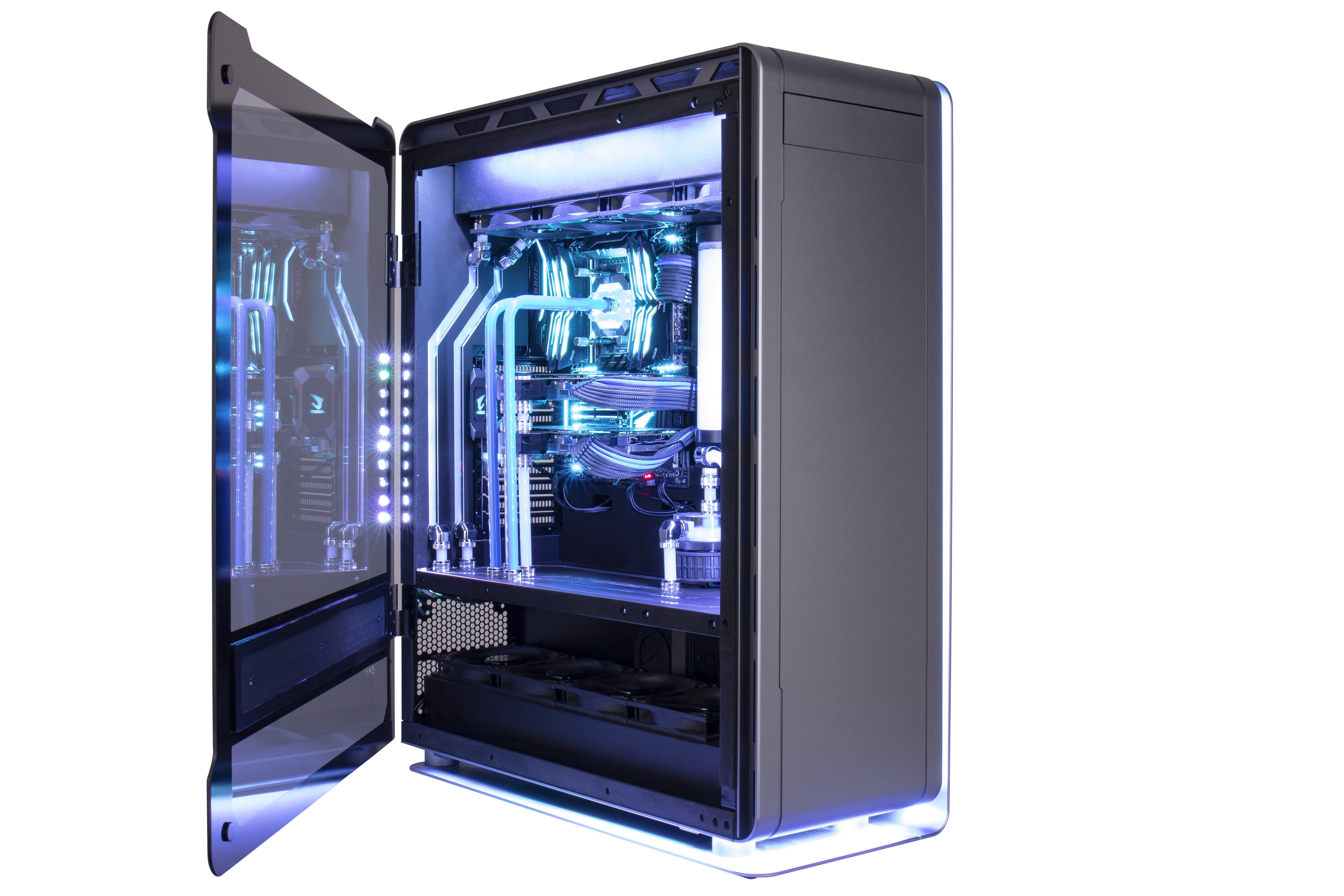 The Obelisk makes use of Thermaltake’s Tower 900, built for showcasing true aesthetic potential. Nvidia’s dual GTX 1080Tis make another appearance, this time backed by Intel’s Coffee Lake i7-8700K at 5.1GHz.