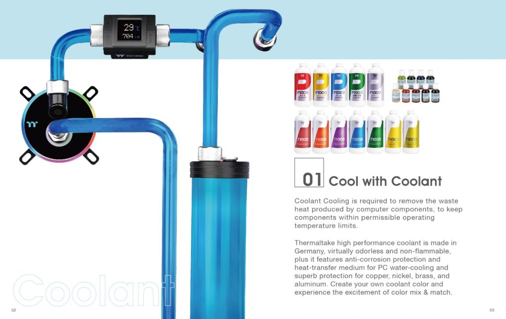 ‘Coolant’ is the term used for the liquid that runs through the tubing in order to cool components. While aesthetic is important given the range of colours and transparency available, the main priority is to ensure that the substance is non-flammable, anti-corrosive and effective at transferring heat. Thermaltake’s coolant ticks all of these boxes, as well as being “virtually odourless.”