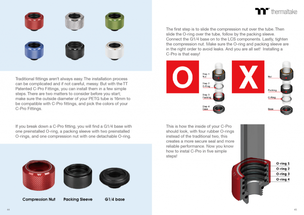 Many first-time users find themselves worried about choosing the wrong sized fittings, or damaging the components when installing them. Thermaltake states that its C-Pro Fittings are designed to be easy to handle, provided that the user is utilising 16mm PETG tubing. The Compression Nut slides over the tubing first, followed by the O-Ring, the Packing Sleeve and then the G1/4 base. Once these are in order, the user simply needs to tighten the Compression Nut in order to avoid leaks.