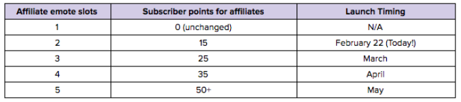 Affiliate members still begin the programme with one Tier 1 emote slot regardless of whether they have any subscribers. Starting today, Affiliates with 15 subscribers or more will unlock a second emote slot. Those with 25, 35 or 50+ subscribers will have to wait until March, April and then May to unlock an additional emote slot bringing it to a total of five emotes in Tier 1, one Tier 2 and a single Tier 3 emote overall.