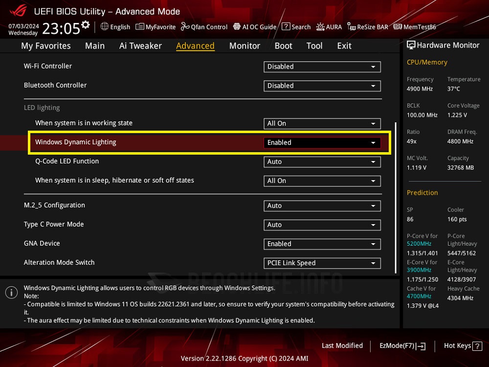 Asus has already enabled this feature for headphones and laptops, but it seems it has already started to extend support to include motherboards. A recent Benchlife report (via VideoCardz) revealed that Asus motherboards equipped with AMD 600 and Intel 700 chipsets (picture is of a ROG Strix Z790-E Gaming WIFI) now support Windows Dynamic Lighting. This functionality can be activated or disabled via the BIOS under the LED Lighting tab.