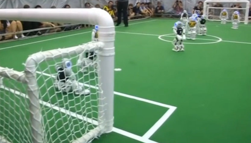Although there are different leagues for teams to take part in, with various parameters for the types of robots used, in the Standard League, everyone has to use the same ones, so it's more of a programming challenge than an engineering one. However the AI aboard the foot high, bipedal robots has to work cooperatively with its fellow teammates, whilst working against the other team. Programming that in the real world is very difficult.