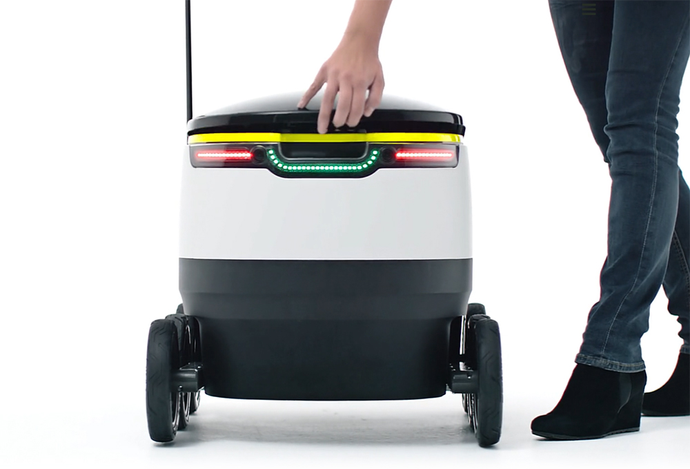 The little robots can travel up to four miles per hour on pavements and are capable of carrying two bags of shopping weighing up to nine kilos a piece. The idea is that a small fleet of them could be present at shopping centres in suburban areas, where they can deliver food to houses after it's been ordered online. The little vehicles would only open up when reaching their intended destination and when activated via secure application.