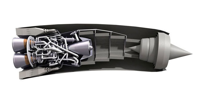 Its design is able to operate as a traditional rocket engine and as a jet-turbine, letting it fly through the atmosphere, using the oxygen in the air as its oxidiser (instead of carrying hundreds of tonnes of liquid O2), only switching over to rocket mode and using onboard stores of O2 when the atmosphere thinned out.