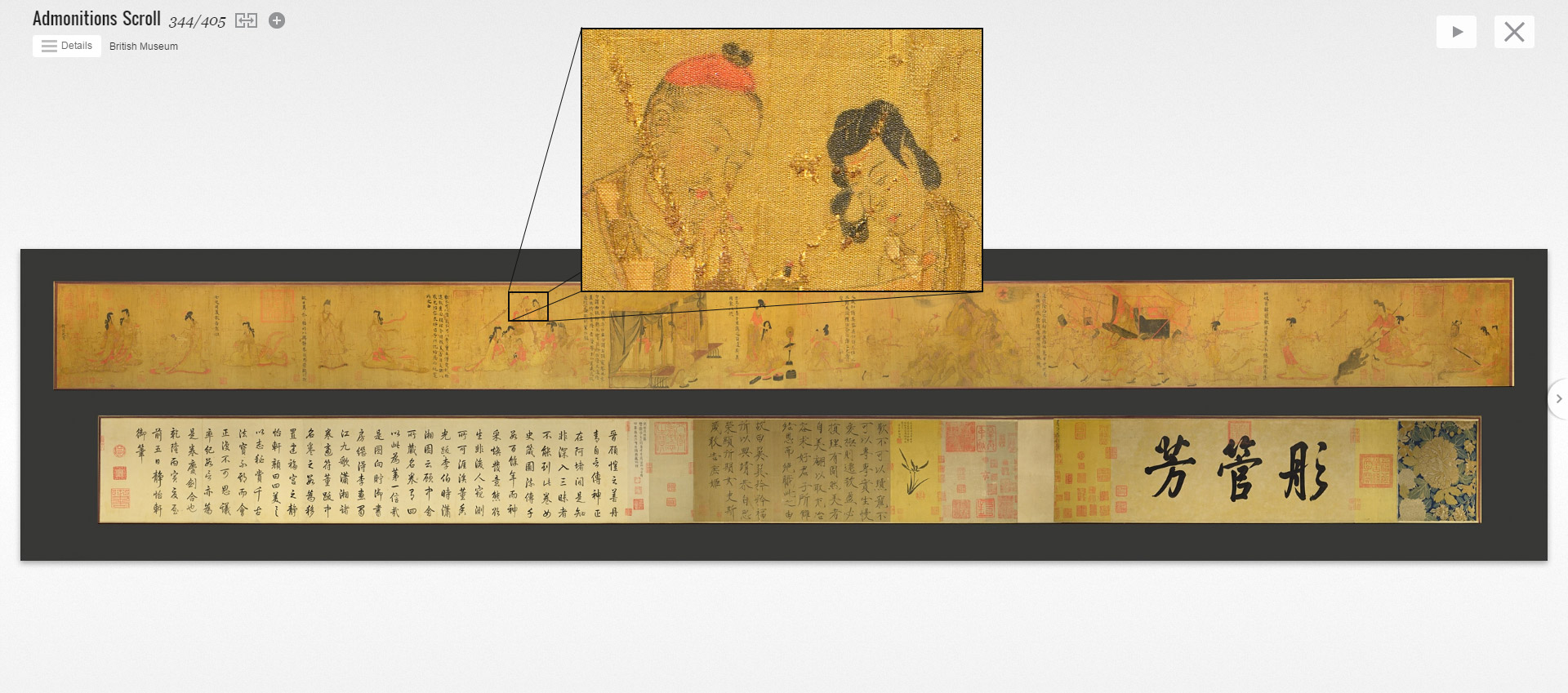 Google has also gone to great efforts to scan objects in high detail. In one example, a fourth century Chinese scroll was photographed in high enough detail that viewers can zoom in and look at its intricacies. In person you would never be allowed so close, as they are so fragile and are only showcased for a few months of the year to help aid preservation.