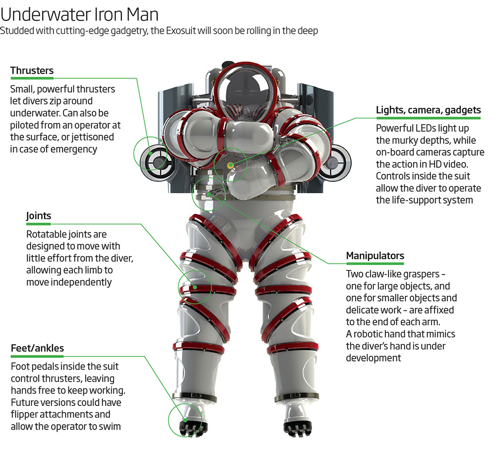 The suit that's being trialled in sea water conditions at the moment and will eventually be used to dive the ancient wreck, was initially designed to investigate New York City's water treatment facilities. It features foot powered thrusters for propulsion (thereby keeping the hands free), rotating joints for added movement, manipulation claws in the arms for gathering or examining large and delicate objects, and a mass of lights and HD cameras to record the best images of the wreck every taken.