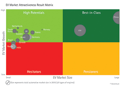 “What is clear is that government policy can rapidly change the rules of the game, more than any other factor,” said Christina Raab, managing director in Accenture’s Automotive practice. “For example, China has set targets for EV and plug-in hybrids to make up seven percent of total car sales in 2020 and 40 percent in 2030, reaching an estimated 15.2 million units. In parallel, China is hoping to see breakthroughs in battery and motor technology, while planning to build a nationwide charging network.”