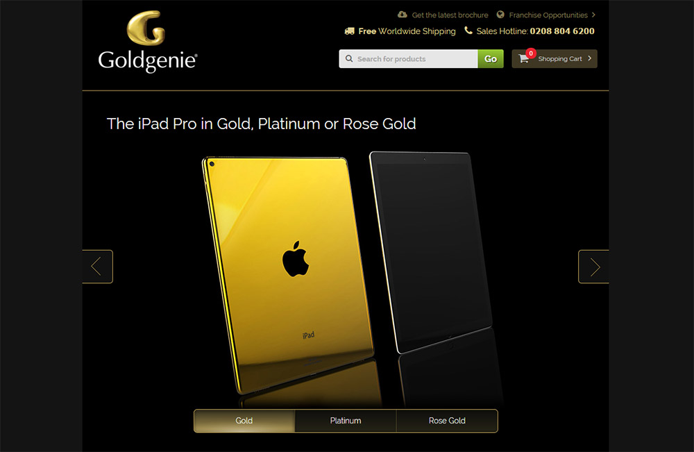 If you really want a gold touch-screen Apple device though and can't quite afford the brand new iPad Pro, Goldgenie does also offer plating services for existing hardware. You can have an iPad of any type plated in yellow gold for £830 + VAT, but if that's too rich you can also have your iPhone done for £530 + VAT. £614 if you want it in platinum.