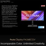 The ProArt Display PA348CGV is an ultra-wide 34-inch display that sells for £800 in the UK. It has a resolution of 3,440×1,440 (21:9) and uses IPS 10-bit technology to power a 120Hz refresh and 400 cd/m2 peak (350cd/m2 typical) brightness. The Asus ProArt Display PA348CGV supports 98% coverage of the DCI-P3 colour standard and 100% sRGB/Rec. 709 wide colour gamut.