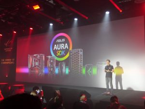ASUS also announced the AURA SDK which will allow app developers to better program their software with AURA compatibility in mind. A demo was shown to be switching the system lighting colour based on the chosen class shown in a game and when taking damage from enemy fire.