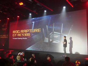 The ROG Rapture GT-AC5300 is a powerful router with eight individual antennas. Designed for heavy streaming and gaming households, eight Gigabit Ethernet ports are provided, two of which feature gaming prioritisation. The AC-5300 tri-band router is powered by a 1.86GHz quad-core CPU and had a current rating of 3.42A on a 19V input (as read from the information on its sticker). It will be available in Europe in May.