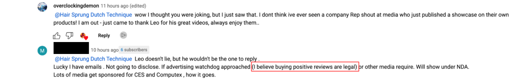 Above: One of over 30 public comments by ASUS UK PR representative reads “I believe buying positive reviews are legal”. Comments may get deleted by ASUS, but we have recorded all of them. Directors from ASUS UK asked us to send over the evidence and we did. Now, around 4 months later, we have yet to hear anything back.