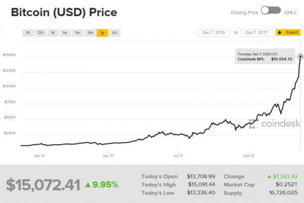 Bitcoin crossed the $15,000 mark for the first time earlier today, marking another major milestone. Over the course of 2017, Bitcoin has been breaking records on a monthly basis, with value consistently creeping up. For reference, this time last year each Bitcoin was worth $766, so value has shot up at a huge rate.