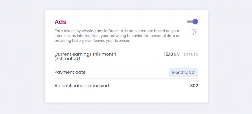 The new advertising system is opt-in only and is being rolled in to the Brave Rewards system. Once switched on, users can choose how often they would be willing to view ads on a per-hour basis, scaling up to 5 ads per hour. Users that choose to view these ads will get a 70 percent cut of the advertising revenue in the form of a Basic Attention Token (BAT), which is a form of cryptocurrency based on Ethereum. These tokens can then be converted into your local currency via Uphold, a partnering cryptocurrency exchange site.