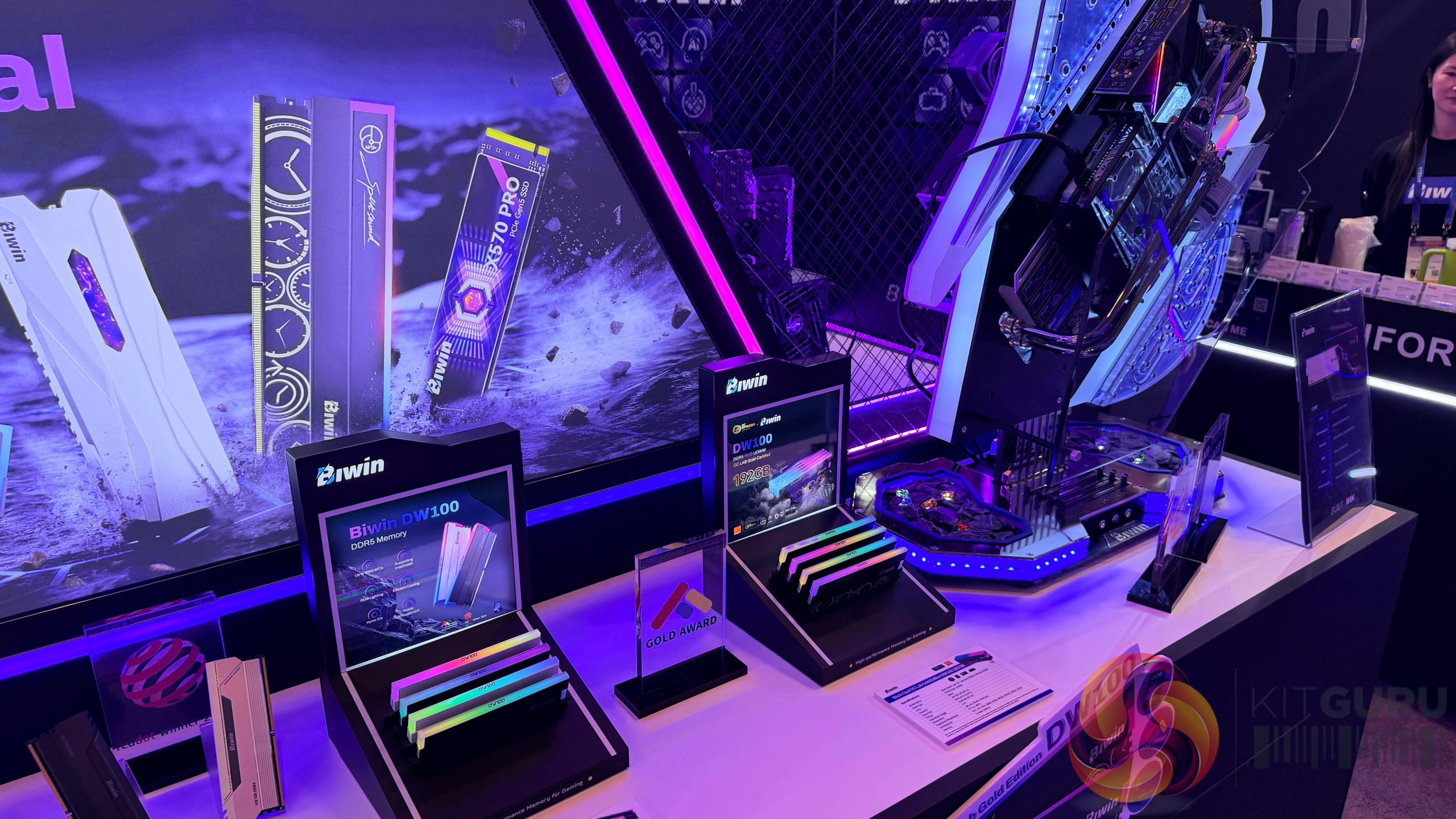 On the memory side, the DW100 DDR5 memory, which was the recipient of a CES Innovation Award, was on display. These modules reach up to 8400MT/s, with RGB variants rated up to 9200MT/s and CL42 latency for high‑end gaming and enthusiast builds.