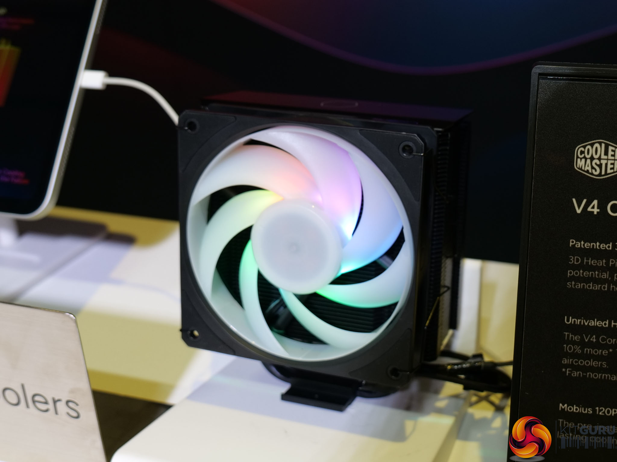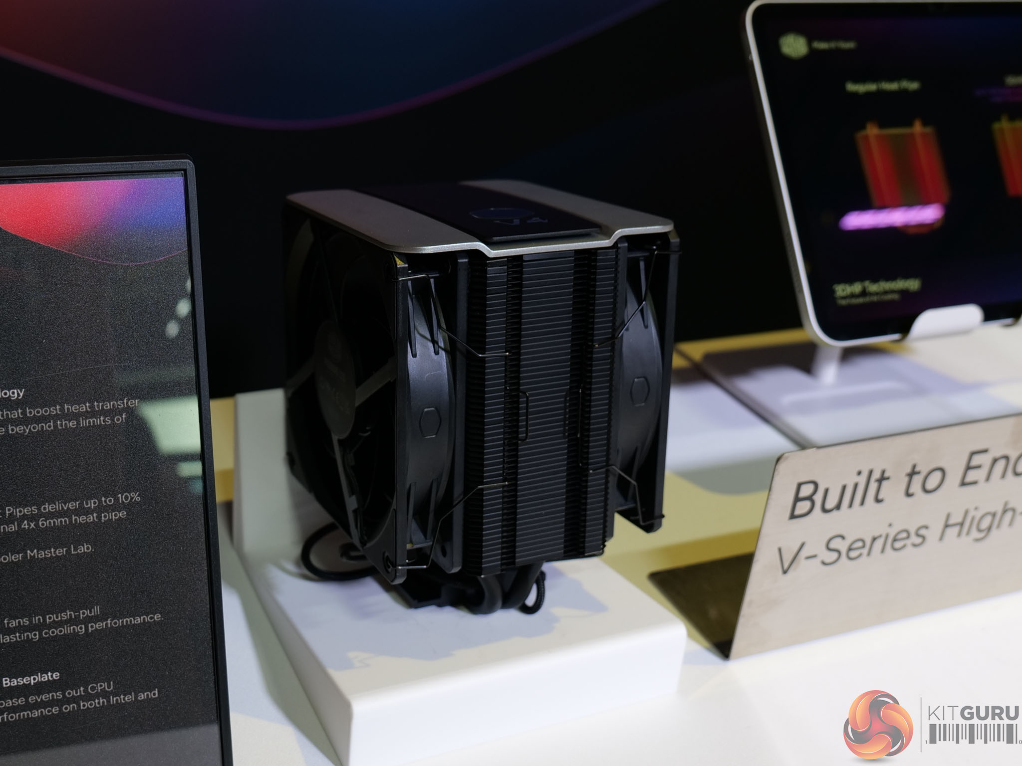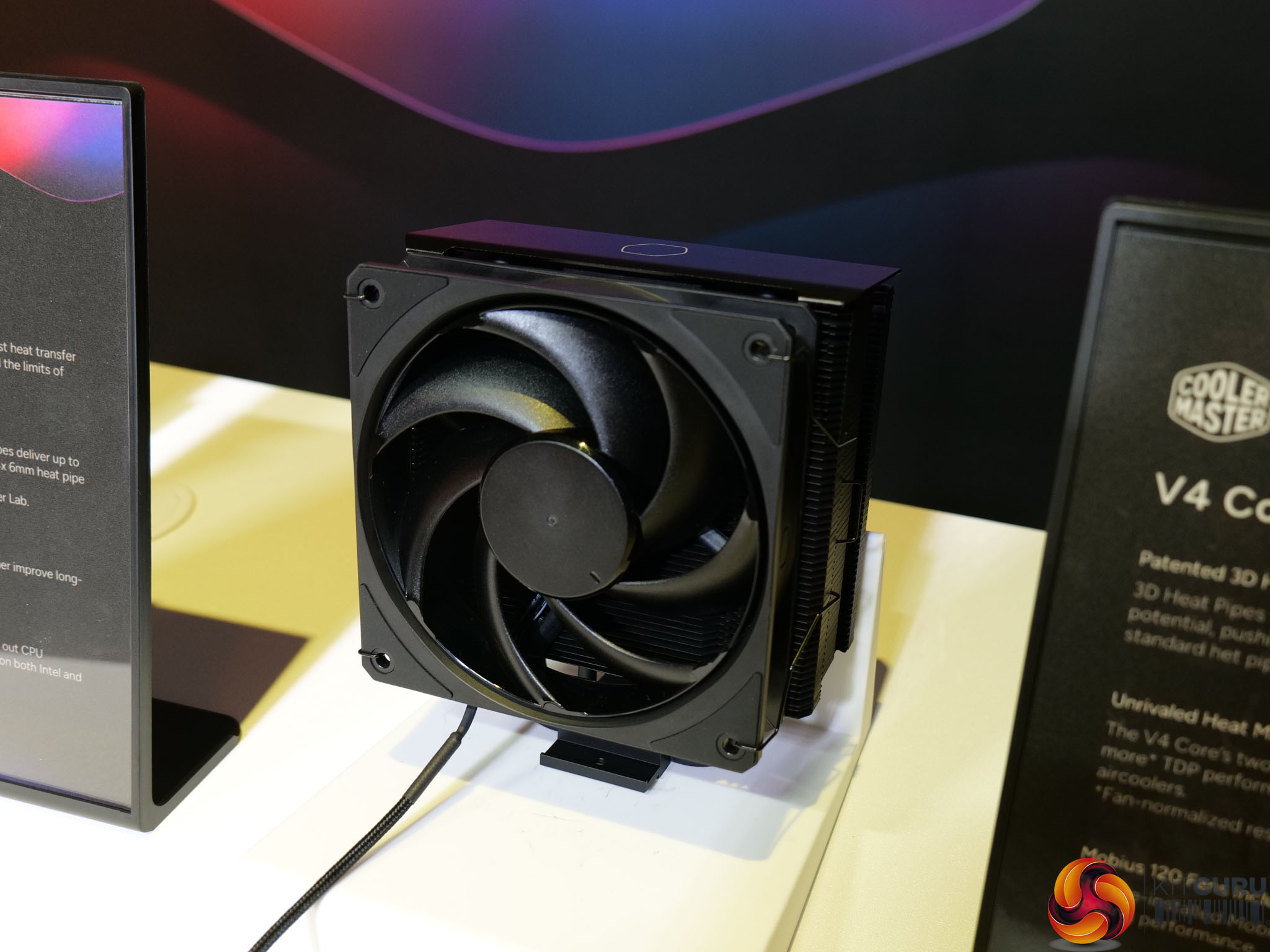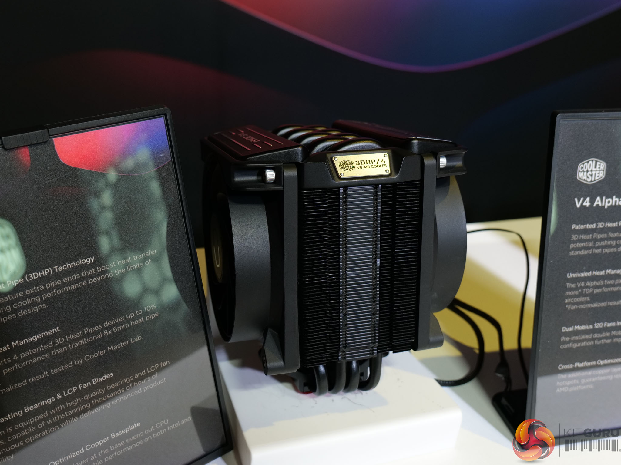 On to air coolers, and we find that Cooler Master has a new slate of V-series CPU coolers. They all feature 3D heat pipes, which runs the heat pipe through the middle of the fin stack to better distribute heat. This new heatpipe design will be used in the massive Cooler Master V8 GTS cooler, and the more tame V4 cooler.