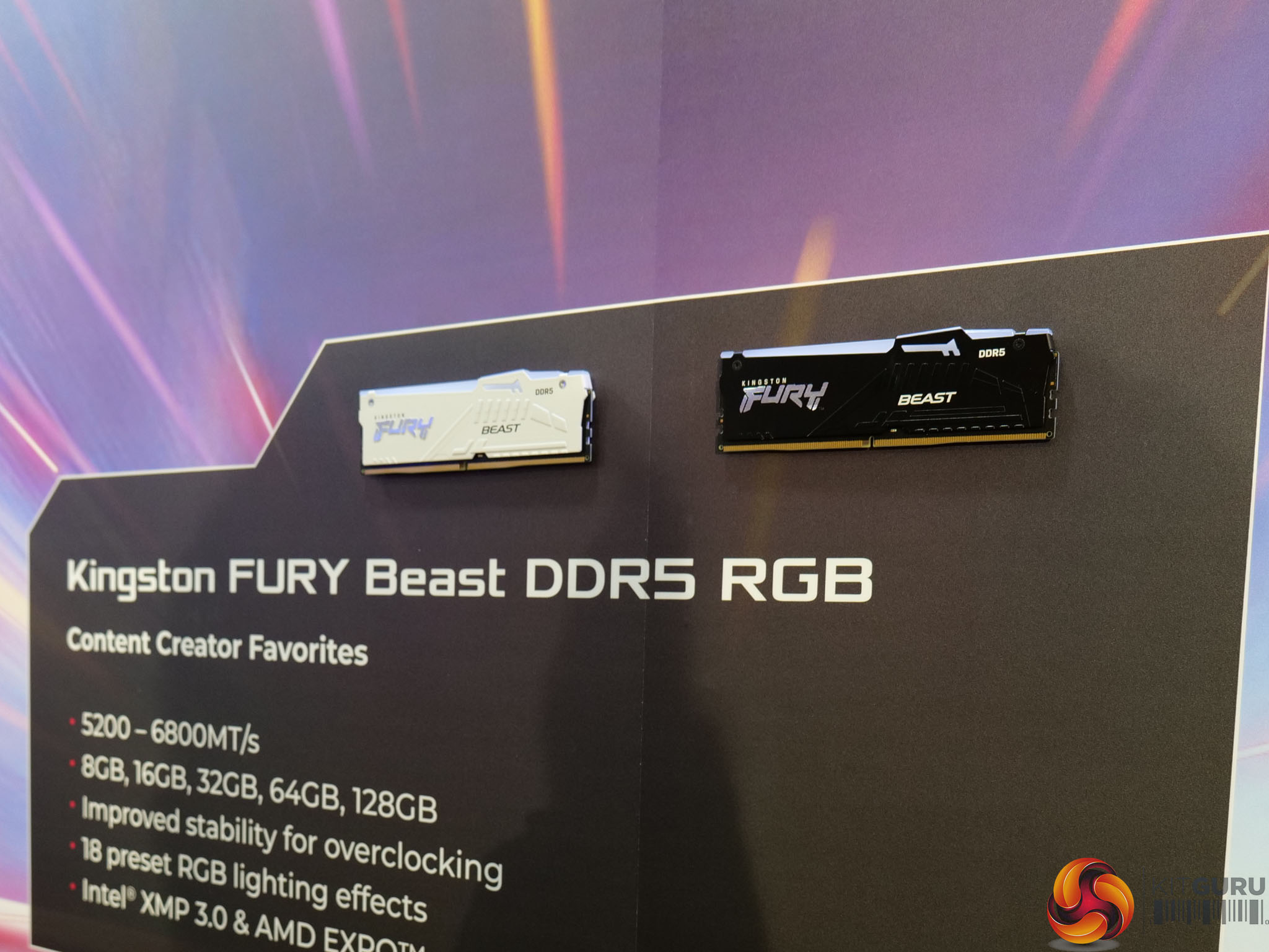 Moving on to RAM, we have the Kingston Fury Beast DDR5 line-up, offering up to 6800MHz speeds and up to 128GB capacity. Kingston also has CUDIMM DDR5 memory on show, which Leo has used in Intel Arrow Lake-based systems before. These modules offer up to 8800MT/s speeds and utilise Infrared Sync technology to keep the RGB lighting uniform across all modules.